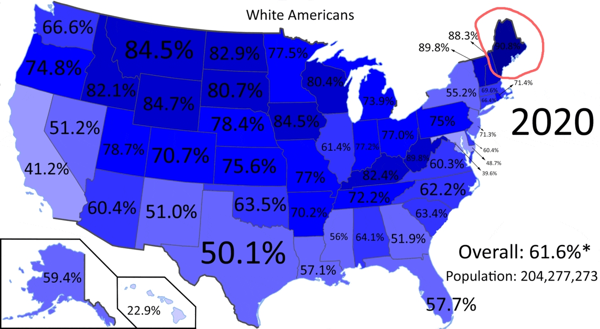 >>532823444Interesting map.Texas is the only state with less than 50% white people, which was a huge news story a couple of years ago.Since it says California was as of 6 years ago, along with no realizing New Hampshire is the whitest state in the country, I'm going to go ahead and point out 90% of the shit you read on the internet is a complete fabrication.