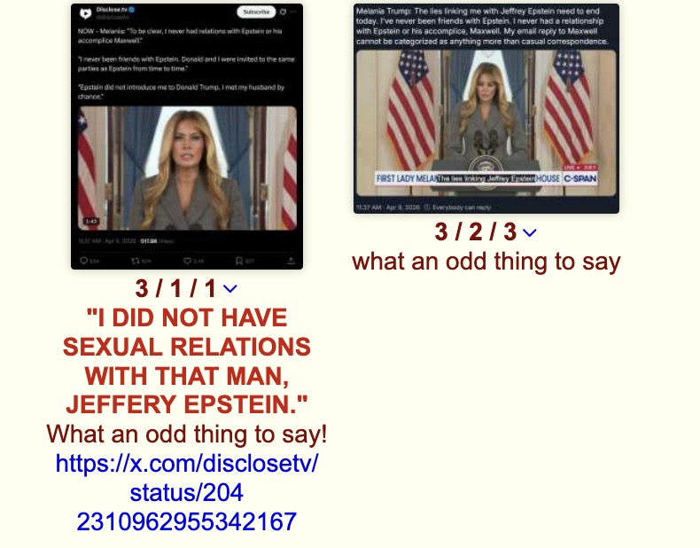 >>532826252Considering the fact that Trump completely spurges out when someone even mentions epstein, his wife talking about epstein on camera means things are not going well in that house.