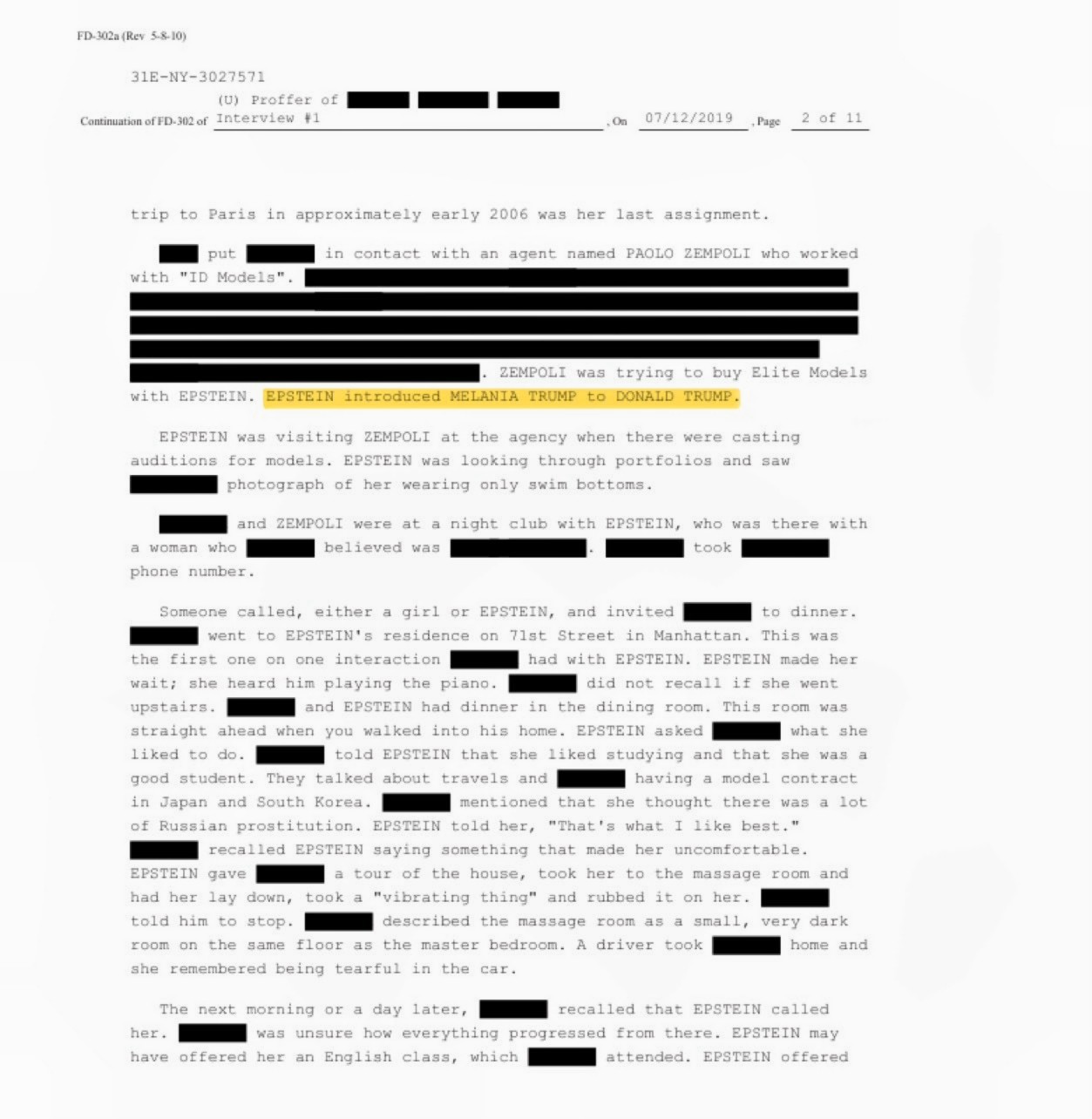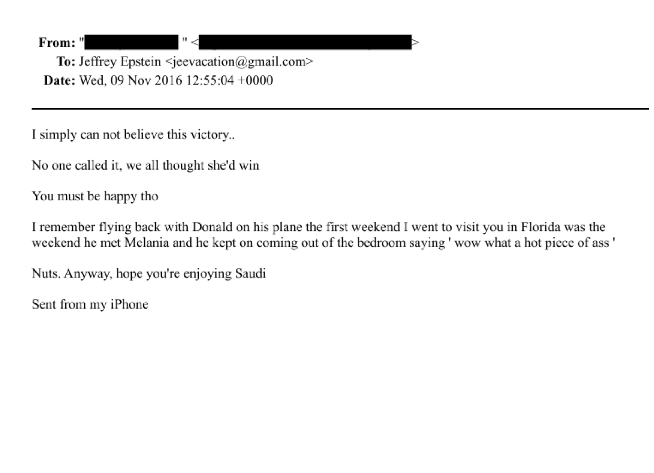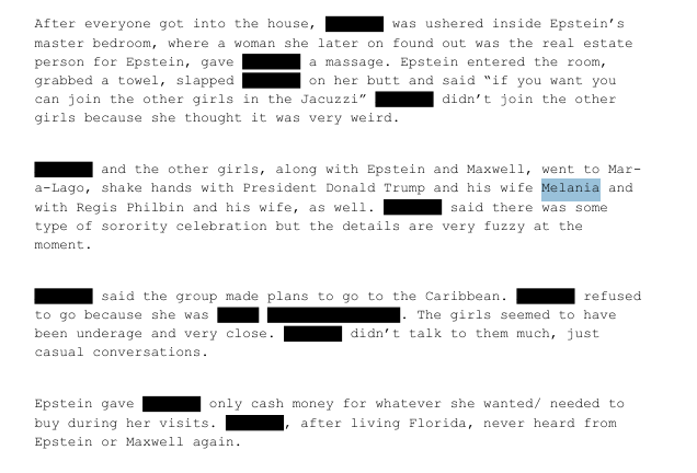 >Another email released in the Epstein files from a redacted sender to Epstein right after the 2016 election also mentioned Melania Trump’s first meeting with Trump, suggesting there was an Epstein link.>“I remember flying back with Donald on his plane the first weekend I went to visit you in Florida was the weekend he met Melania and he kept on coming out of the bedroom saying’ wow what a hot piece of a—,’"