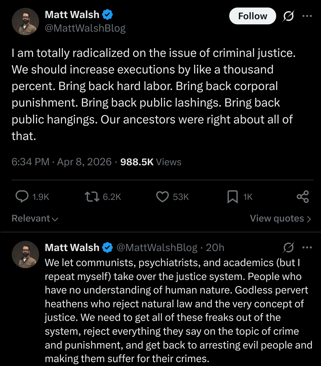 >>532827321>The kind of person to be dissuaded into not murdering out of fear of punishment is not the kind of person to commit murder anywayThat's the point. It's to punish and remove violent criminals, not to reform them or scare them.Justice is to create catharsis for the people/citizenry. Jews don't really understand justice, hence why we "keep broken people" away or try to "reform" them. That's not how justice works.