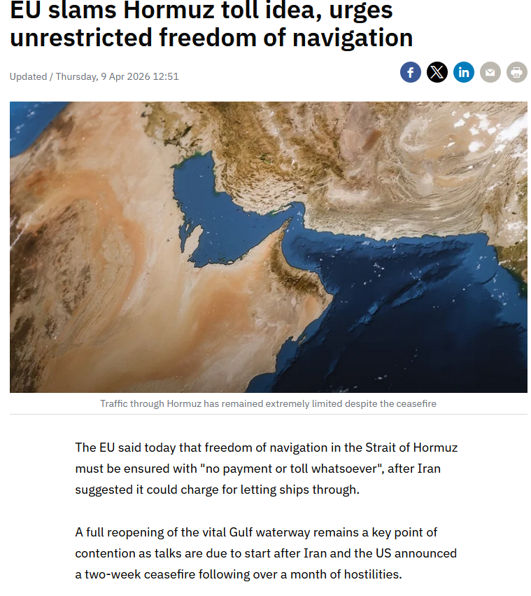 https://www.rte.ie/news/business/2026/0409/1567391-eu-slams-hormuz-toll-idea-urges-freedom-of-navigation/>The EU said today that freedom of navigation in the Strait of Hormuz must be ensured with "no payment or toll whatsoever", after Iran suggested it could charge for letting ships through.>A full reopening of the vital Gulf waterway remains a key point of contention as talks are due to start after Iran and the US announced a two-week ceasefire following over a month of hostilities.>"International law provides for the freedom of navigation, which means basically no payment or toll whatsoever," European Commission spokesman Anouar El Anouni told a press conference in Brussels.It's over for iran. Now they have no choice but to give up their ambitions of controlling the strait forever, because if they don't then the EU will make yet another statement calling iran big mean bullies, then iran will feel VERY bad about their illegal actions. Can the persian people endure such a horrible punishment?