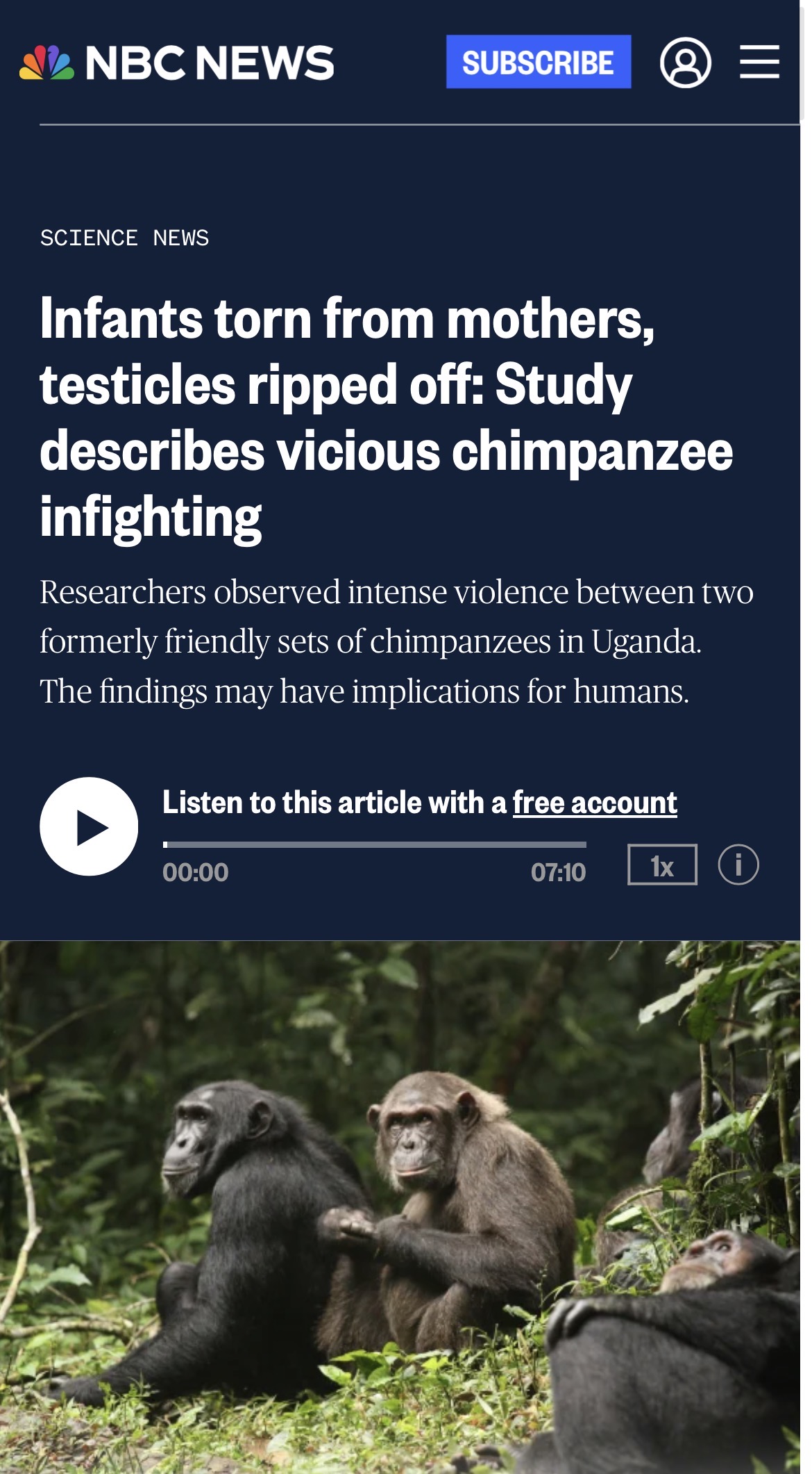>At least 28 chimpanzees — including 19 infants — have been killed since, according to the first research paper describing the events, which was published Thursday in the journal Science.>”Here are individuals who have helped each other before and cooperated,” Mitani said. Now, “they view each other as the enemy.”NO MORE BROTHER WARS