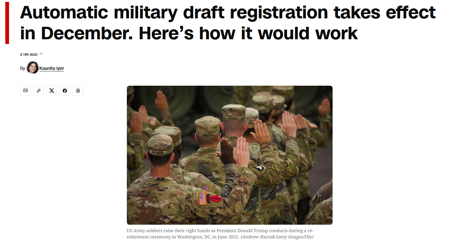 >Young, eligible men will be automatically registered for the military draft pool starting in December as part of a measure tucked into the annual defense policy bill Congress signed into law late last year. > According to the National Defense Authorization Act, which President Donald Trump signed into law in December, the automatic registration will apply to male US citizens and “every other male person” in the country between the ages of 18 and 26.>The mandatory registration applies to green-card holders, refugees, asylum seekers and undocumented men. Those on a nonimmigrant visas are exempt.https://edition.cnn.com/2026/04/09/politics/us-military-draft-registration-2026lol, import a million jeets and send them to die in Iran.