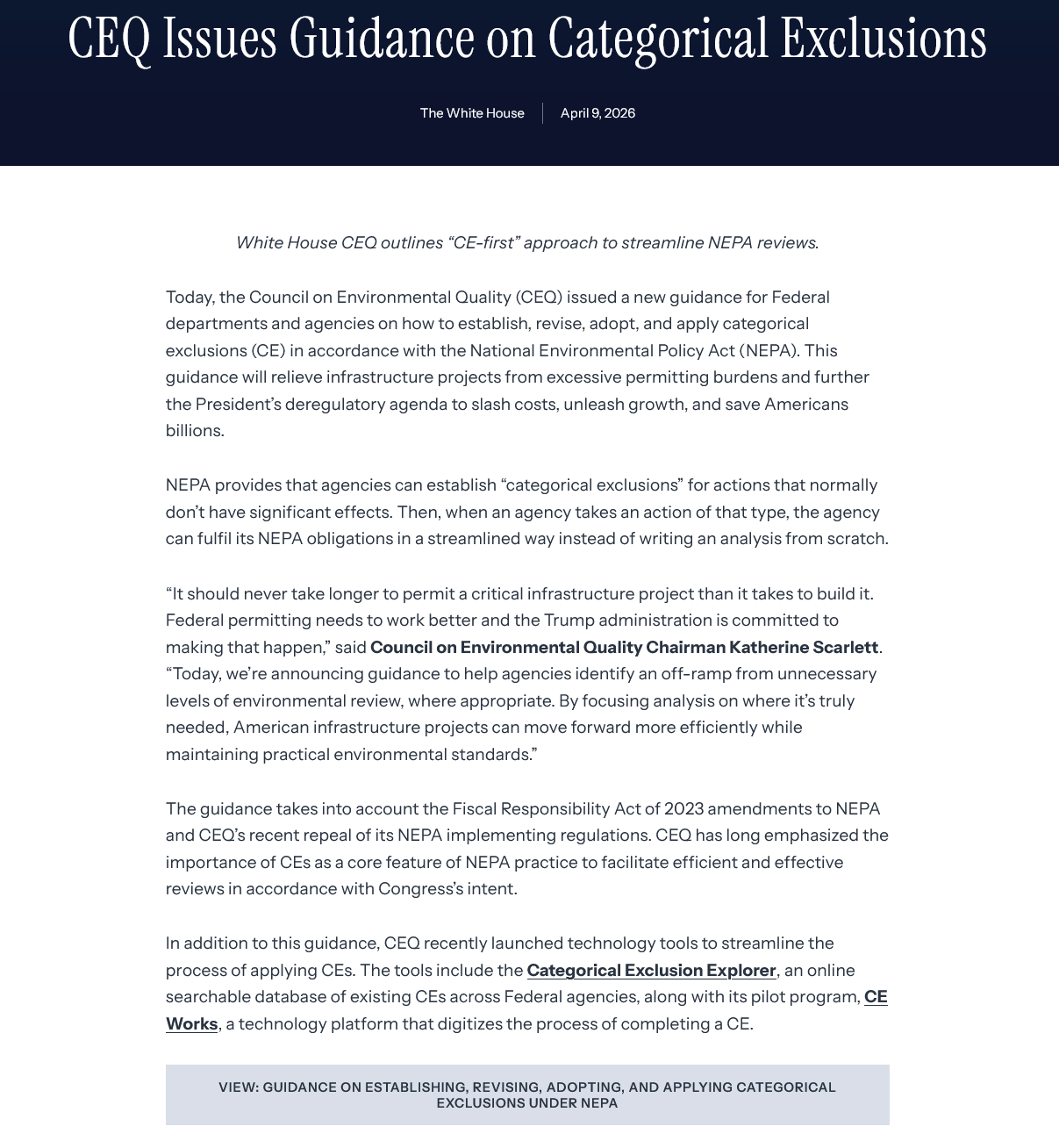 https://www.whitehouse.gov/releases/2026/04/ceq-issues-guidance-on-categorical-exclusions/