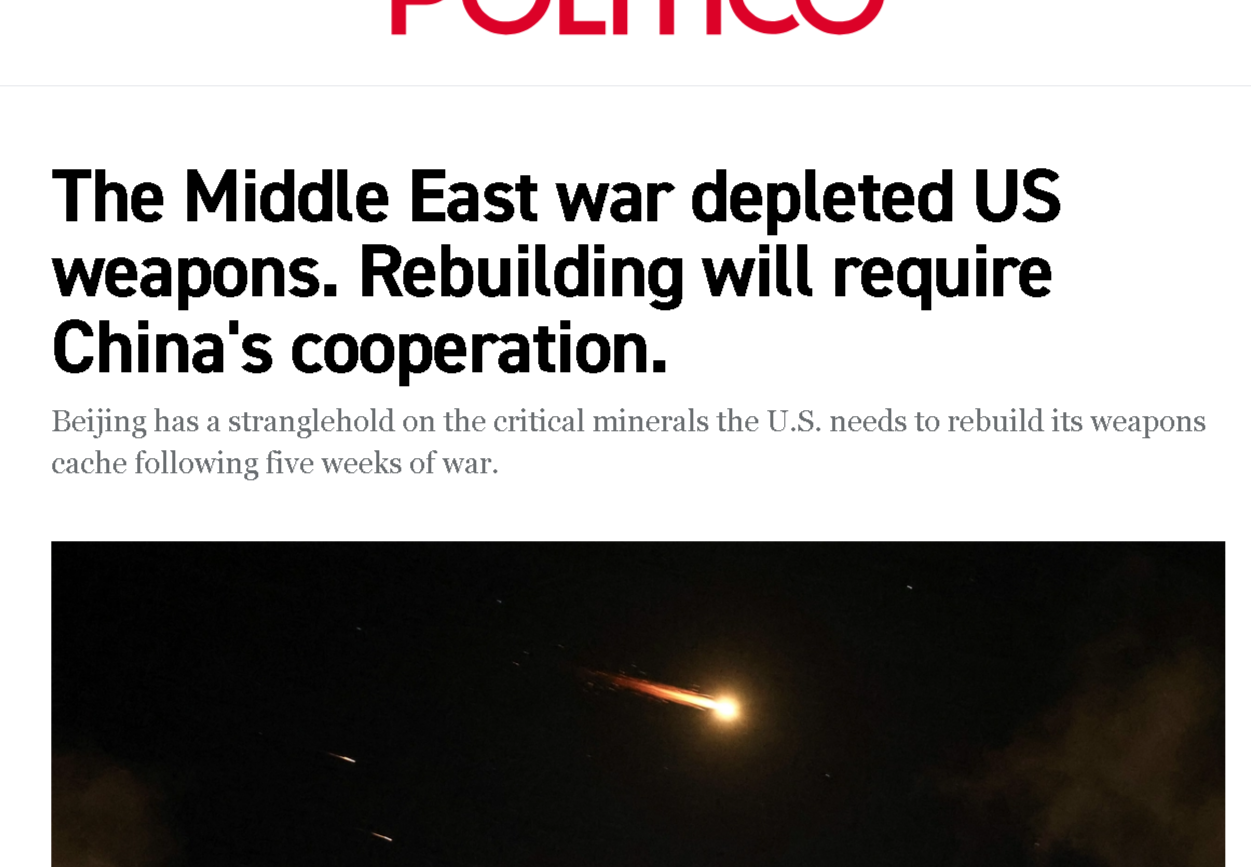 The US will have to ask for China’s permission to obtain the materials required to rebuild its depleted and destroyed equipment after the war with Iran