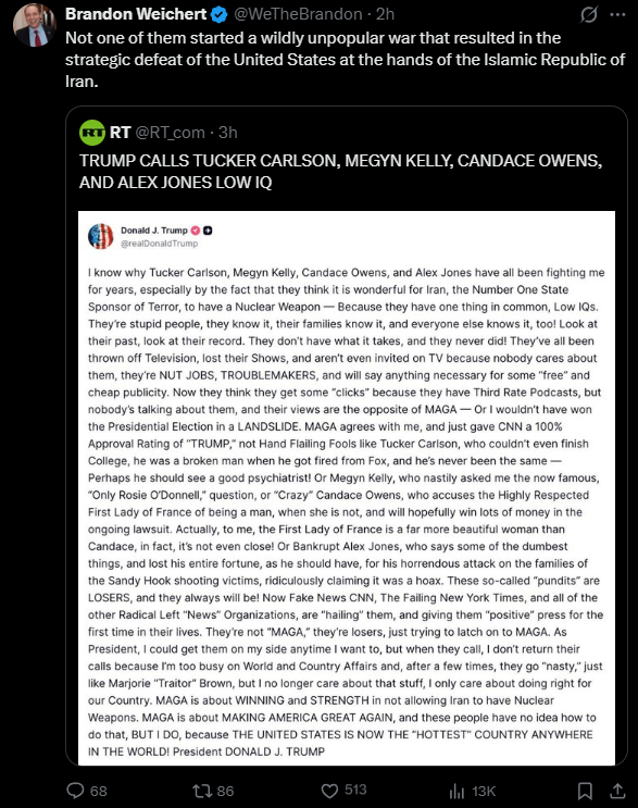 >>532841552Megyn campaigned with him and shilled for him for at least 3 years. She dared to question Israel and the war with Iran, and so, since zion don has no loyalty whatever despite demanding 100% loyalty toward him, he attacks her.