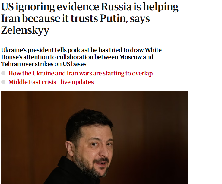 Weeks ago, Zelensky offered America what he called "irrefutable proof that Russia was providing Iran with targets for their missiles and rockets". But then americans just ignored Agent Z, who complained that he didn't succeed at starting World War 3 against Russia with his "irrefutable proof".https://www.theguardian.com/world/2026/apr/09/us-ignoring-evidence-russia-is-helping-iran-because-it-trusts-putin-says-zelenskyyZelensky is now seething about it, and laughing at american perils for having ignore him.