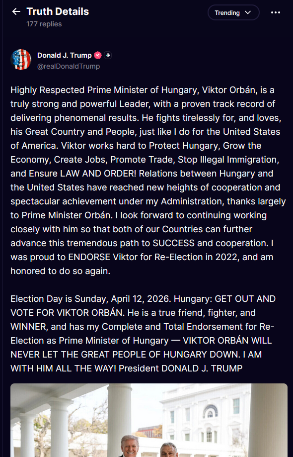 >>532841066A Trump endorsement seems like the best way to ensure Orban loses.