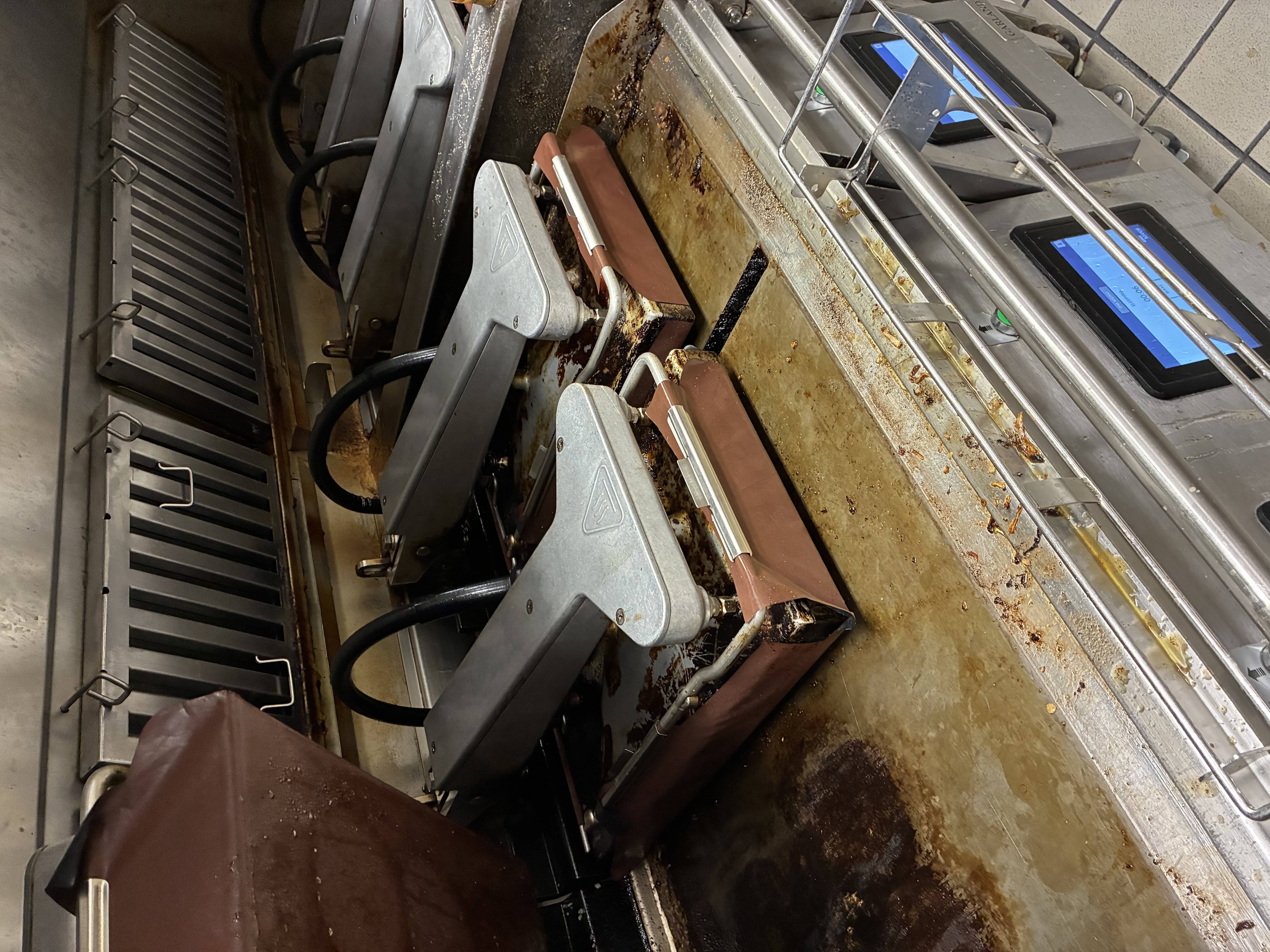 >>532842085I made a thread about how McDonalds is cancer and got banned, this is what the grill looks like. The sheet on the top is Teflon, that melts into your food. We replace it every time it melts too far.