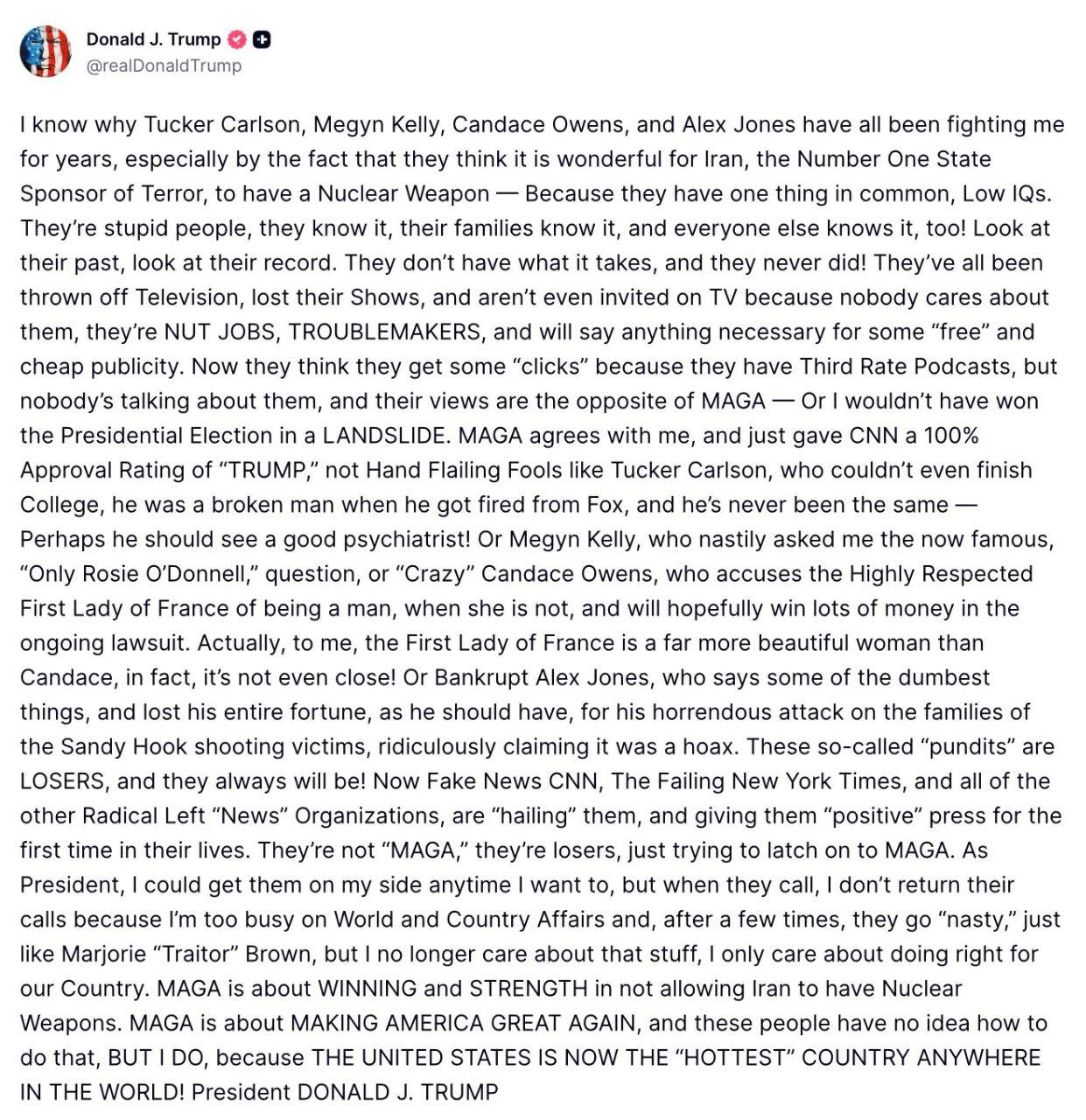 >TRUMP CALLS TUCKER CARLSON, MEGYN KELLY, CANDACE OWENS, AND ALEX JONES LOW IQHe finally had a nervous breakdown. Hahahaha