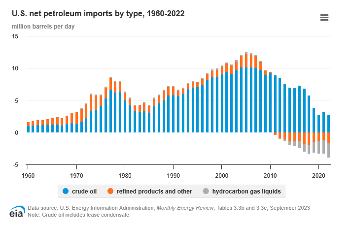 >>532859605The USA still imports more crude oil than it produces. It does refine oil products from crude for straight export but you're still short ~2.6 million barrels per day of sticky black goodness. There's also the API Gravity of oil, of which the USA doesn't have every 'blend' of. Thus, the USA is still heavily effected by crude oil disruptions.A lot of charts muddy this by using petroleum imports/exports instead, of which the USA does export more petroleum and other refined products than it imports.