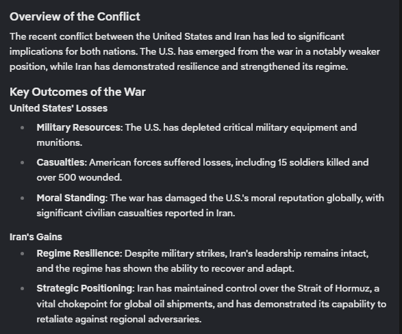 So far it seems like the US has been taking a loss in every aspect of this war while Iran has gained a much better position than what it had before. Why does the US keep going with the war when by every metric it is losing and why isn't Israel helping out more? It is literally the US doing everything.