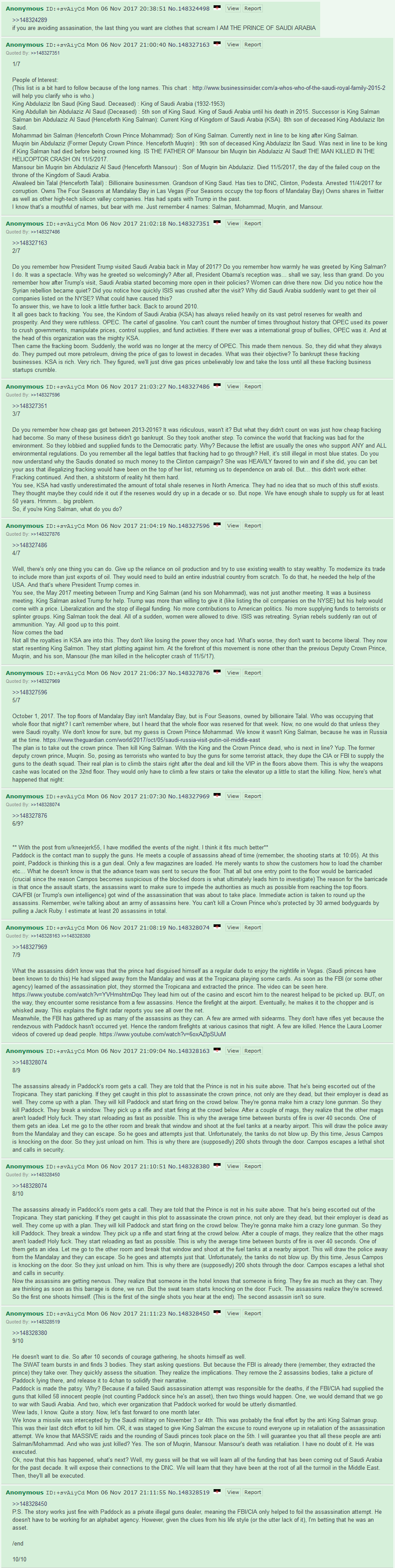 >>532850019A faction within the Saudi intelligence agency tried to do a coup and assassinate Crown Prince Mohammed bin Salman. They were going to shoot MBS and then try to make it seem like he just randomly got killed in a mass shooting.Paddock was already dead long before the actual shooting. The Saudis used some local escorts to make contact with Paddock and tell him that some rich arab oil sheiks were coming to Vegas to party, and they wanted to go out in the desert and shoot "machine guns" and would pay shitton of money for the experience. Paddock got a bunch of bump stock meme guns and set them up for a "meet and greet" to show them to the rich arabs. The Saudis showed up, killed Paddock, took all the AKs he brought, and left the rest.MBS's security detail successfully stopped the assassination, but the mass shooting cover had already started.LVPD eventually found Paddock in his room with guns everywhere, but the whole thing was very suspicious. The Saudis told Trump about what happened, the Feds moved in and quickly covered up what really happened and blamed it on Paddock to prevent it blowing up into a serious international incident. Saudi intelligence committing the worst mass shooting in American history would be 9/11 tier.Trump instead gave MBS carte blanche to do whatever he wanted to get revenge and eliminate the perpetrators. There were several purges of Saudi military and intelligence officials and they executed everyone involved. This culminated in the torture and execution of Jamal Khashoggi, who was a high ranking member of Saudi intelligence.Khasshogi was the leader of the assassination attempt, and he was brutally tortured and executed in the Saudi consulate in Turkey exactly one year to the minute after the attempted assassination and the shooting. While it was happening, MBS brought in all of the other members of the Saudi royal family and high ranking government officials and made them watch a live video feed as a warning.