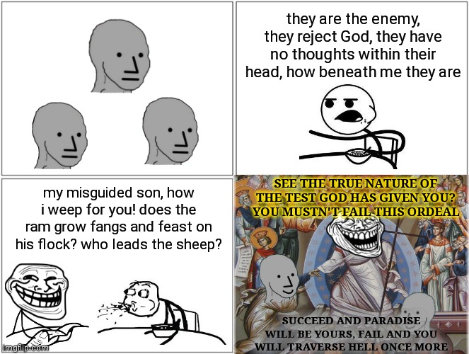 >>532856373With this we may understand that before Babylon falls, Christians must constrain themselves to fighting for the hearts and minds of their own people, so that they do not worship the beast. But then, being obedient to the commandments of Christ, once Babylon does fall then Christians shall indeed have a part in the execution of God’s will against His enemies. So while Revelation chapter 19 began with a description of the bride preparing herself for the marriage supper of the lamb, that preparation is evidently fulfilled as the children of Israel come out of Babylon and turn to obedience in Christ. The Word of God offers no other path to redemption other than repentance and separation from the wicked Society, but evidently Yahweh God also informs us that such a separation cannot be successful until the Society itself crumbles.