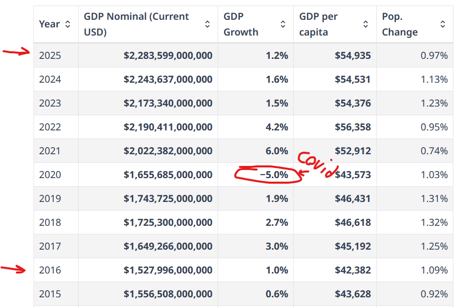 >>532855993>canadian GDP has remained flat for over ten years despite breaking all immigration records.Bro look shit up before you spout dogshit. Even after the massive hit that was Covid it's still grown by a lot.https://www.worldometers.info/gdp/canada-gdp/I'm not a globalist and I'm not pro mass immigration. I just don't deny facts. There's a reason they keep pushing this shit, and it's because it makes their pockets fat.