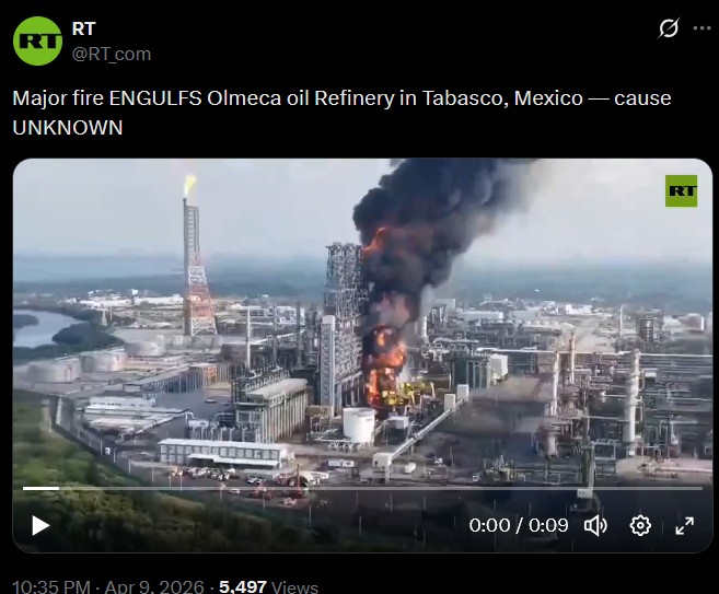 HAPPENING: Major fire ENGULFS Olmeca oil Refinery in Tabasco, Mexico — cause UNKNOWN https://xcancel.com/RT_com/status/2042431291887423586