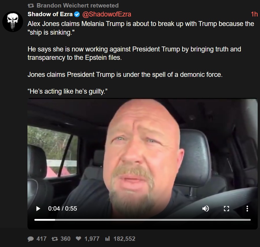 Alex Jones claims Melania Trump is about to break up with Trump because the "ship is sinking."He says she is now working against President Trump by bringing truth and transparency to the Epstein files.Jones claims President Trump is under the spell of a demonic force.“He’s acting like he’s guilty.