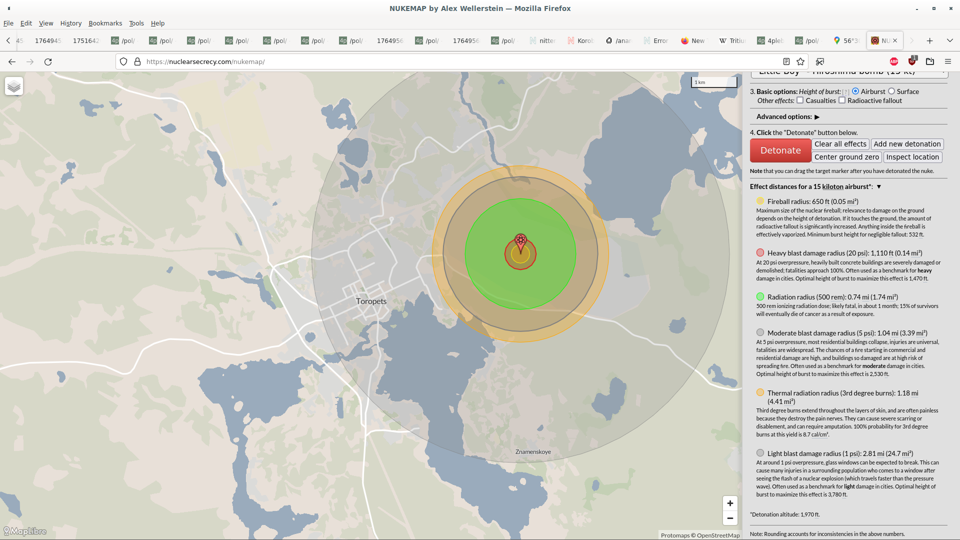 >>532853520That's what the Russians in Toropets did,but the glass all shattered.4 mile radius.Govt made them evacuate for awhile.White people are mad at toropets and disrespect it./k/ /pol/ and /g/ don't like anyone talking about it.Nor does twitter.The effects are the exact same as a 15kt little boy on the military base. Exact same radii: Total 20psi devestation radius (good stuff destroyed), 5psi radius (crap structures destroyed (~nothing in russia, everything in USA and Japan)), and 1psi all glass blown out radius.