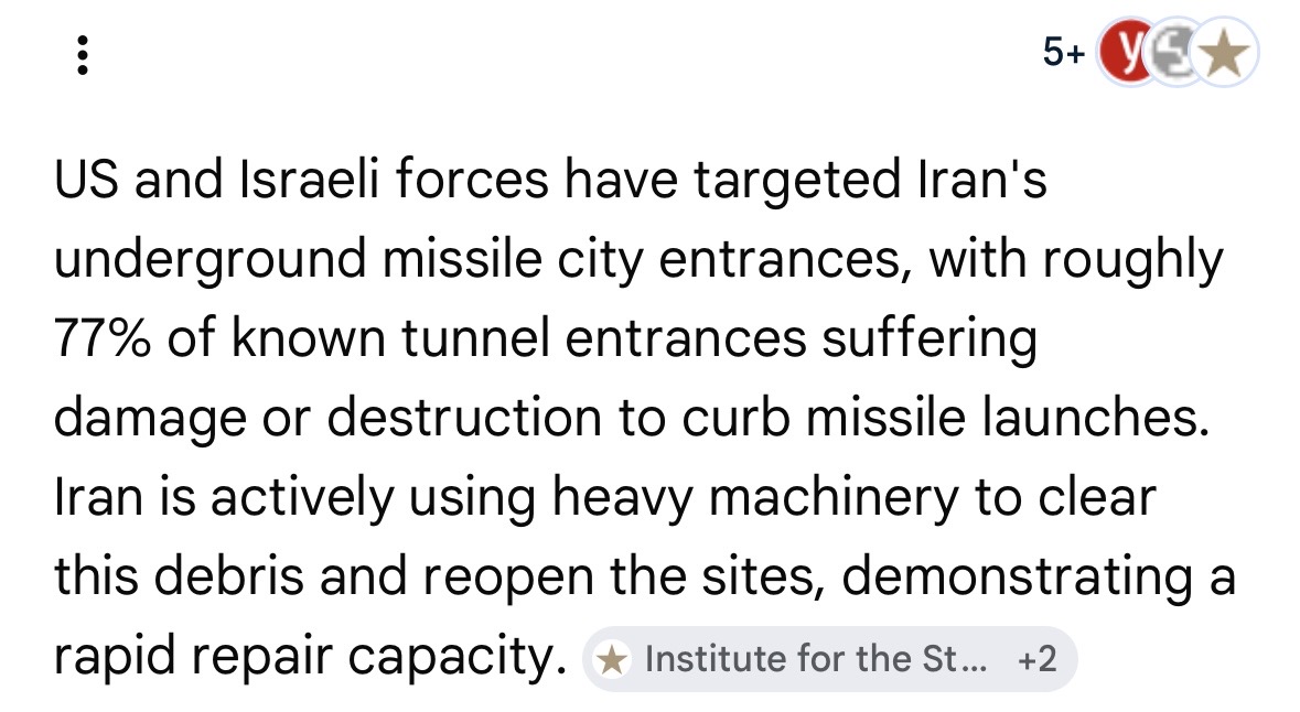 > USA used crazy amount of ammunition/missiles to collapse Iran underground tunnel entrance to stop their ability to fire missiles > Iran is just removing the rocks as we speak and going to just restore their ability to launch missiles