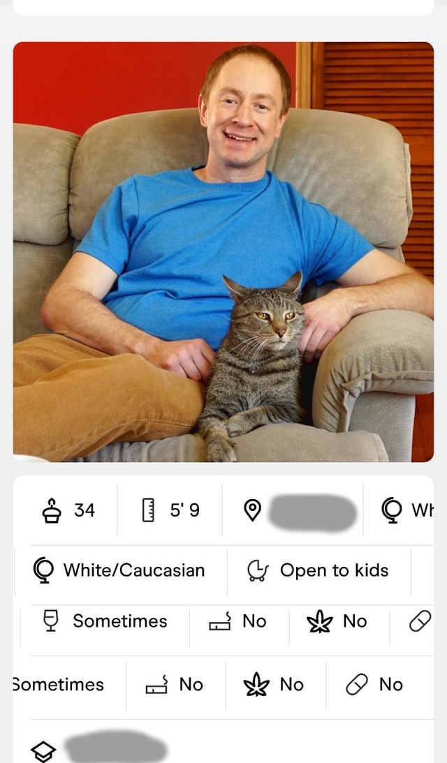 >>532859711what is he supposed to do then?everyone should have a chance to live a happy couple lifei'd say a dating app is not ideal for his profilethis type of person will have a better luck in libraries or yoga classesalso he has a cat which to me means he is probably a nice personi am not homosexual