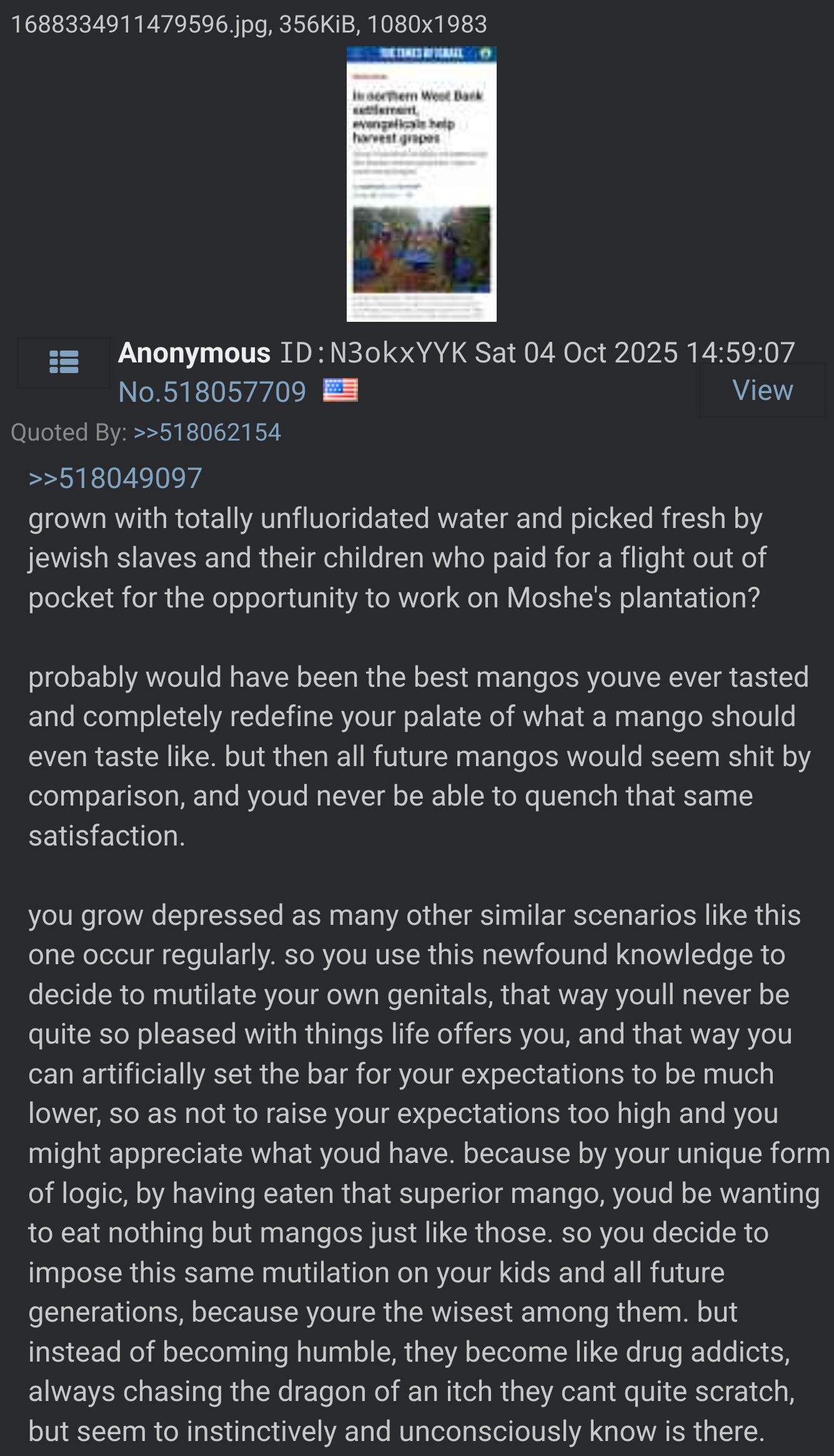 >>532866427theyre the same jew anon. theyre merely acting out different roles.what most people dont know is all spiritual jews will inevitably, if unchecked, become full-fledged jews that are wholly indiscernable from the real thing. contrary to popular belief a jew isnt a torah subscribing circumcised kike, but someone who can be made to believe and do things beyond all rationality, like believing that their god is an insane genocidal schizophrenic jew with a foreskin fetish. then they are inundated with cult brainwashing from childhood to become indiscernable from a "leftist", only their loyalty isnt to the "nation" but to the micro-nation, which is the parasite that is denaturing, corrupting, subduing and ultimately consuming the nation.to call jews evil would be an understatement. they are the embodiment of everything it means to oppose divinity and all it has worked to achieve in every sense. whether its cutting down all the trees whenever building, creating food deserts and corrupting the land by hunting animals to extinction not for food but for fun, purposely introducing blights to eliminate natural food sources, killing the most evolved humans divinity would be most proud of or encouraging them to throw their genes away in favor or lesser species, financing further evil, marring natural development in children by mutilating them and altering their behavior, brainwashing them to alter their behavior, telling them loving your family is a sin, and being proud of your son for scoring his first goal will result in you being tortured for eternity, the list is endless. if evil existed, at current developmental standards, jews/worshippers is what it would look like. like npcs.>inb4 christians dont circumciseits really not about circumcising. its about being so morally and spiritually neglected that you could be convinced under the right conditions to do it. if you can be made to believe a jewish guy in sandals is your god, you can be made to believe anything