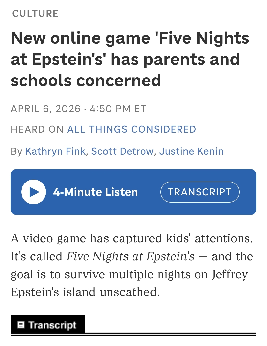 The kids are gonna be alrighthttps://www.npr.org/2026/04/06/nx-s1-5766479/new-online-game-five-nights-at-epsteins-has-parents-and-schools-concerned