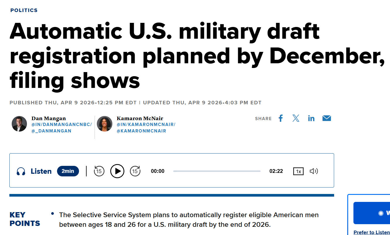 >>532877636This news is some weird psyop. Selective service has been a thing forever. If you're a man over 18 you're ALREADY automatically registered for a potential draft. You probably got a card in the mail about this when you turned 18.