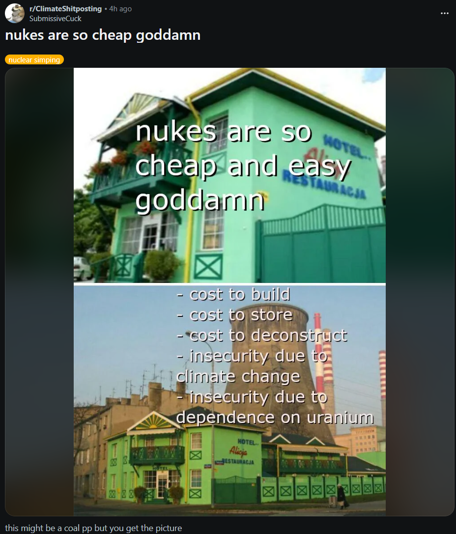 Can someone educate these morons on how economies scale works?>Le costs is too highDue to its grandiose capacity, the cost is divided between millions of consumers.>Insecurity due to climate changeHas literally never happened>Insecurity due to dependence on uraniumFrom Australia and Canada?>Anyone who disagrees with us is funded by le fossil fyool industryPeople like this are the reason electricity is .50c/Kwh.