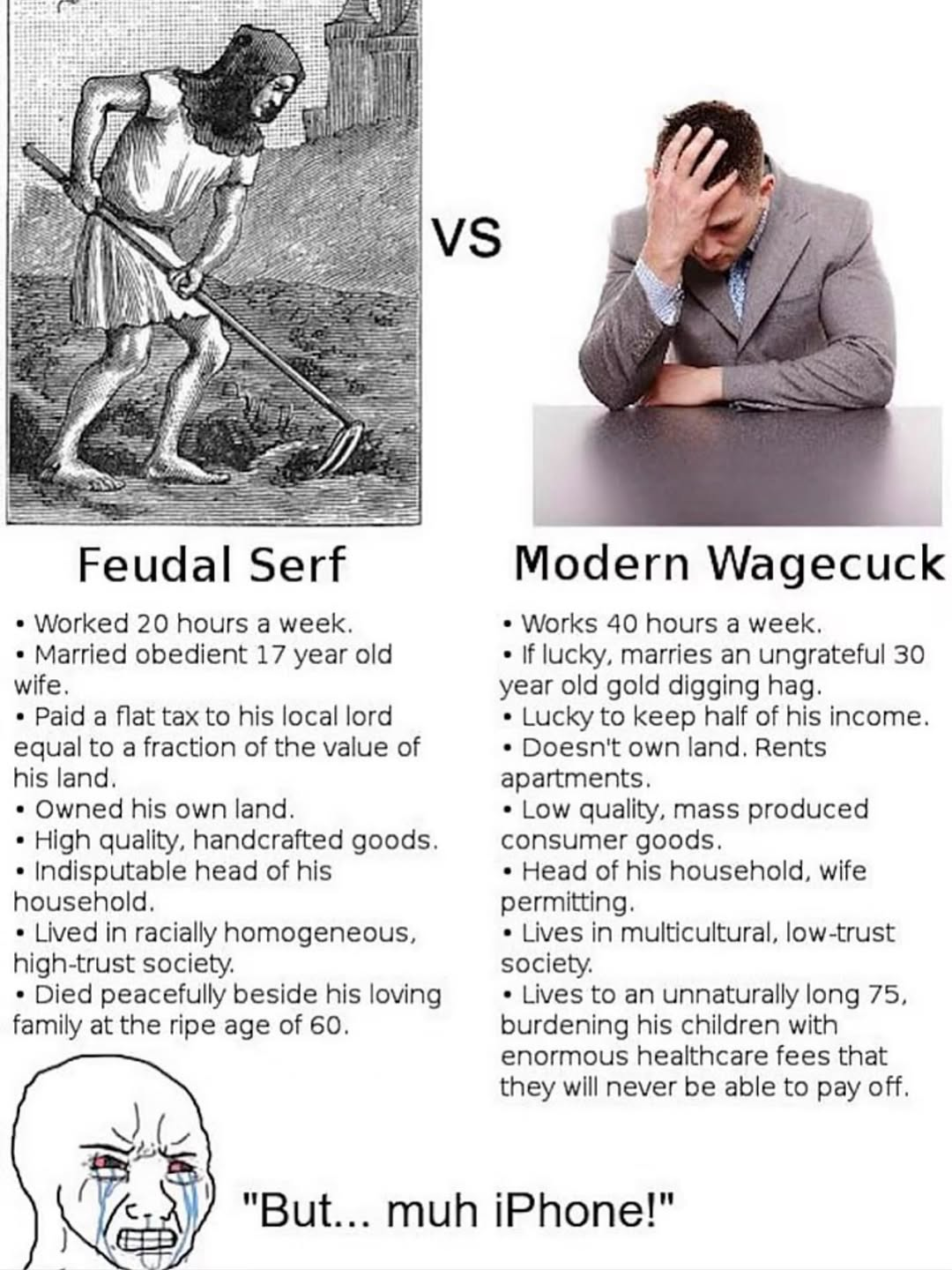 the farm was a guaranteed job though and often came with a wife for life. nothing is guaranteed for you in modern times
