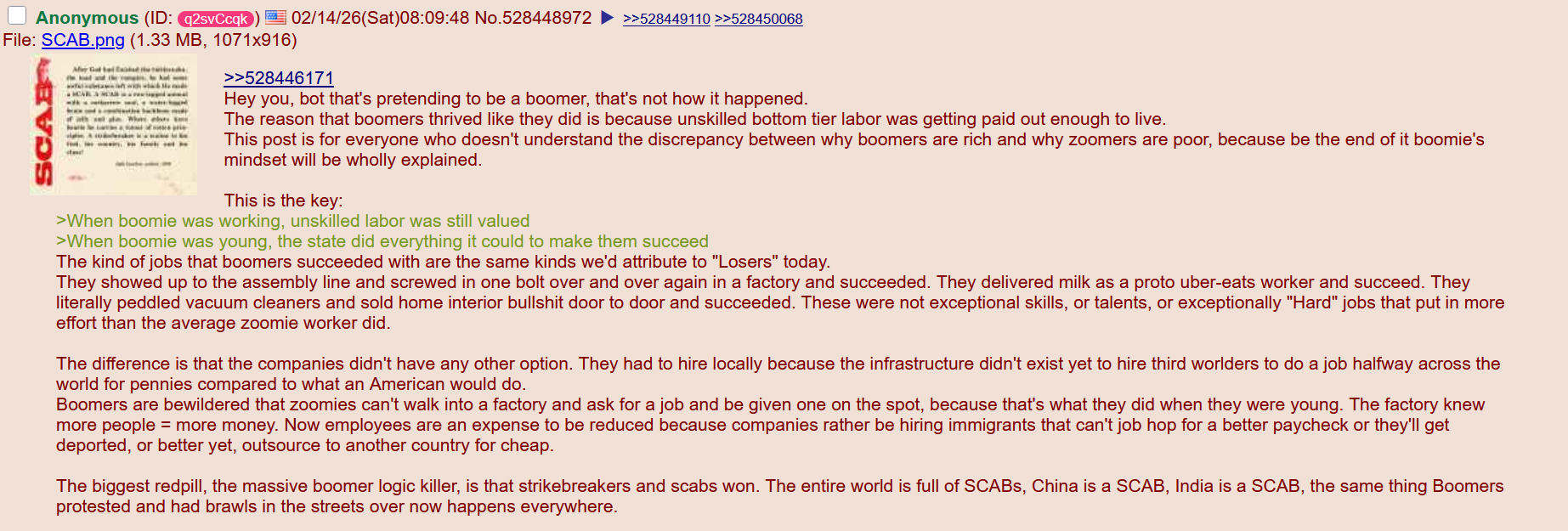 this but unironically. Whiny ass kids in america think they have it so hard today. They have it harder in comparison to the post ww2 golden age, but that was never going to last. That's recency bias. What we've actually seen is not some hardest times in human history cope, it's just a reversion to the mean of normal human existence. The amount of crazy claims on here about this is eye opening. Faggots think they had it harder than europeans who lived through wars and shit, just LMFAO. Even if you limit it to just America, as recently as the GI Generation and the early Silents, they had it far tougher than now. Many of those people lived on farms in the depression. I'm old, they were my grandparents and that shit scarred them for life.