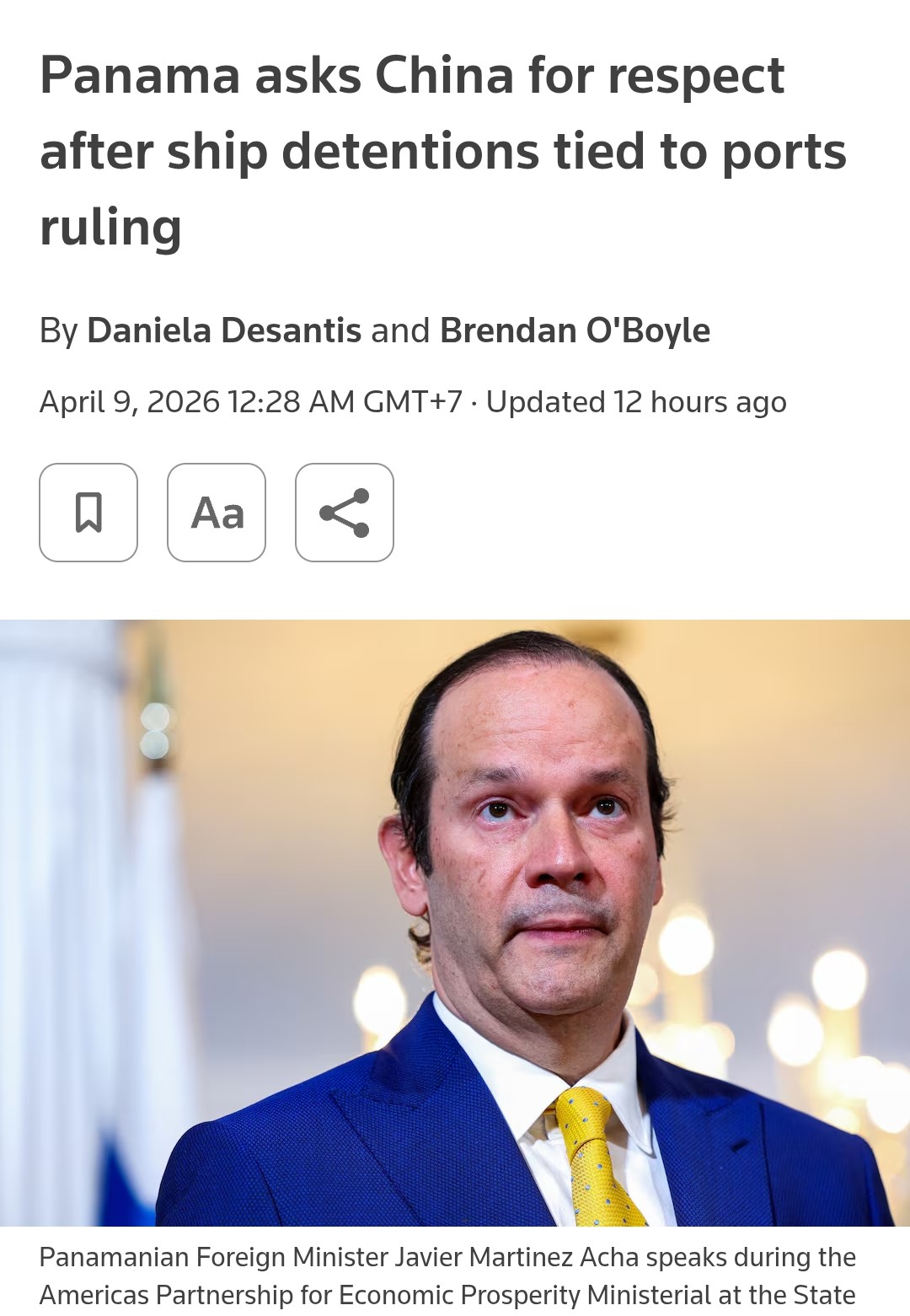 >Panama has requested U.S. intervention after China authorized the seizing of Panamanian vessels for rigorous inspections and confiscation of suspected contraband in response to Panamanian actions taken against Chinese firms at the request of Washington. U.S. Secretary of State Marco Rubio encouraging Panamanians to "stand strong and stay the course," but has yet to say whether the United States will get involved.https://www.reuters.com/world/china/panama-asks-china-respect-after-ship-detentions-tied-ports-ruling-2026-04-08/