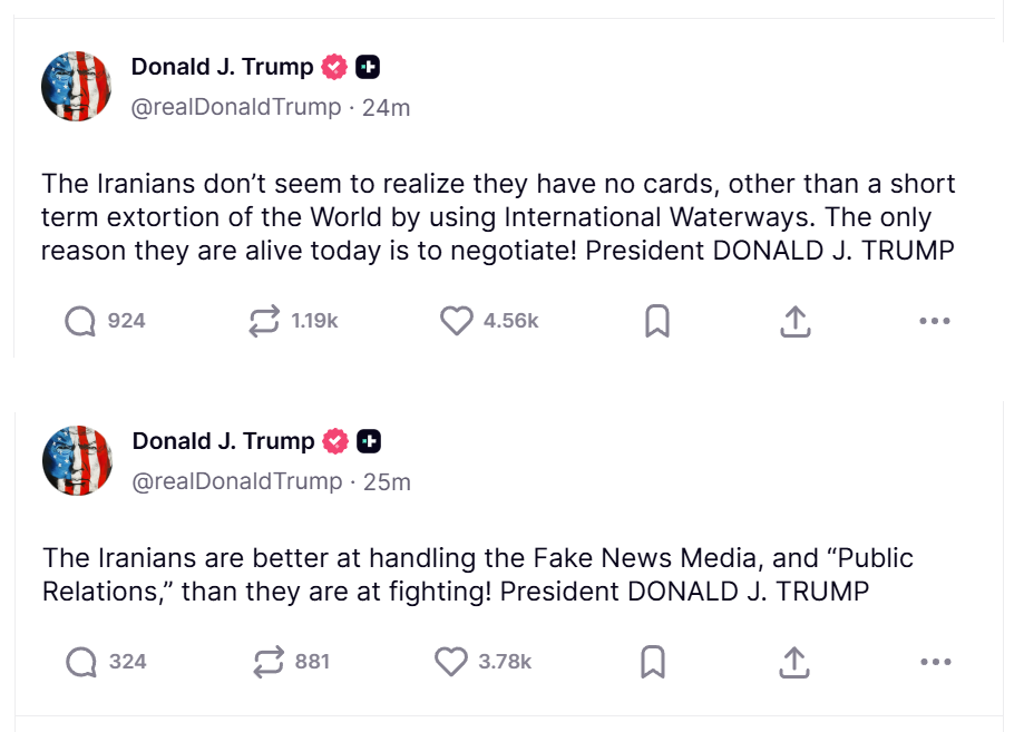 >Trump: Iran has no cardsFunny. If they really were in a bad position then they wouldn’t have closed the strait and pushed for Lebanon to be included in the ceasefire, thereby risking escalation.It’s just projection, HE knows he has no cards.