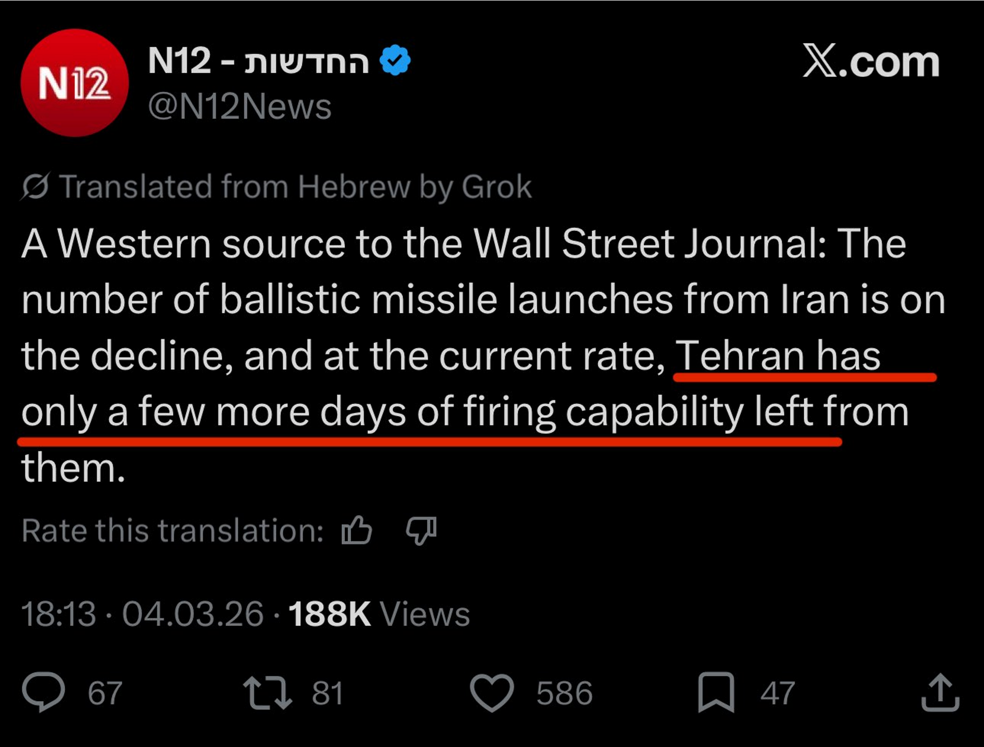 >>532890631He's absolutely right though. >The ceasefire benefits Iran more than it does the USA. Iran has all the cards, they are digging up missile cities, they are replenishing stock. The US and Israel are firing standoff missiles and interceptors faster than they can make them.