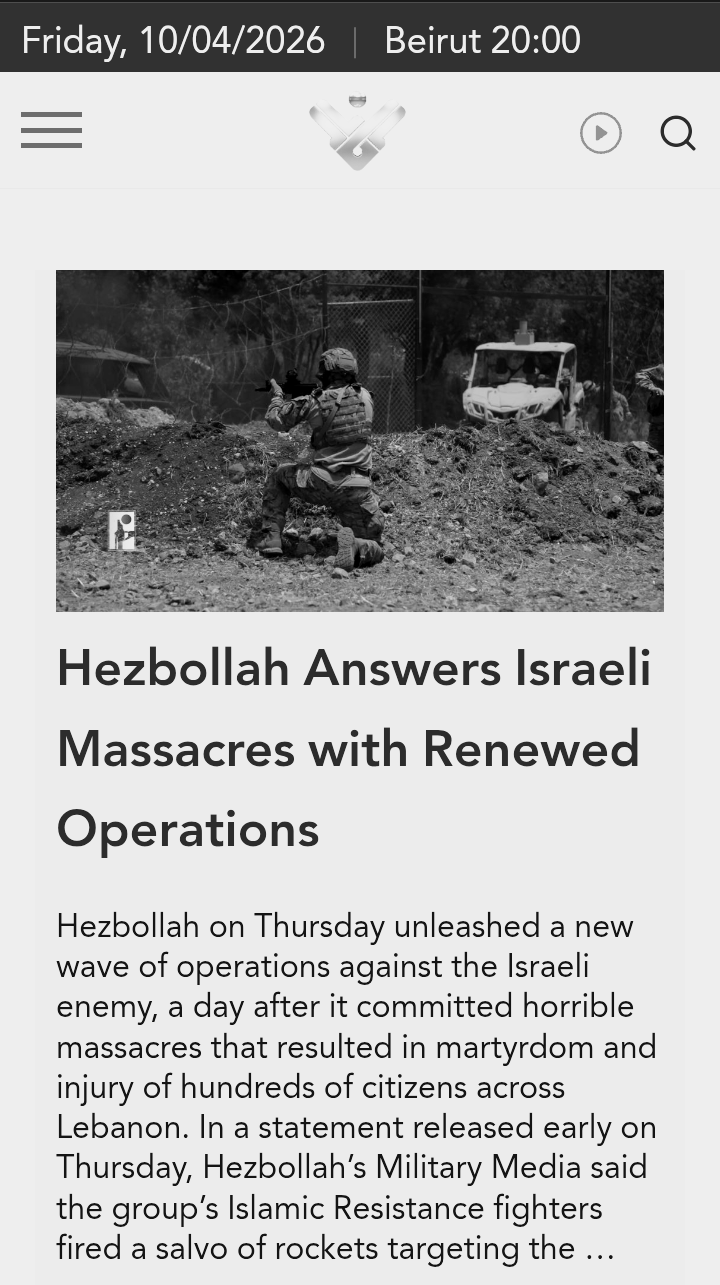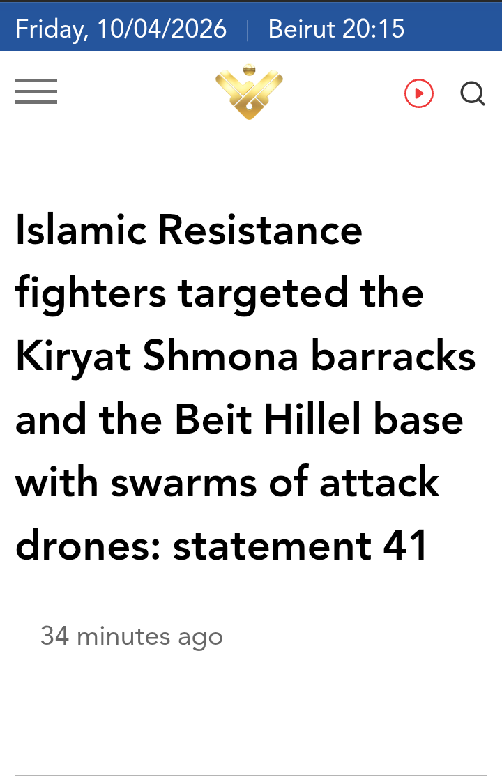 Islamic Resistance fighters targeted the Kiryat Shmona barracks and the Beit Hillel base with swarms of attack drones: statement 41 22 minutes agohttps://english.almanar.com.lb/article/55247/