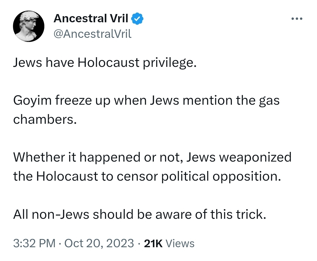 >>532900046You're welcome. I remember when I was a kid, I thought the government wouldn't allow anyone to say anything on TV that wasn't true. Growing up, I never thought much about the holocaust because I didn't regard it as having anything to do with me. It was only when I realized that it was used as an instrument to attack me and dispossess me from my own country that I spent an enormous quantity of time investigating all of the claims. Really an unnecessary waste of time inflicted upon White Europeans everywhere by jews.