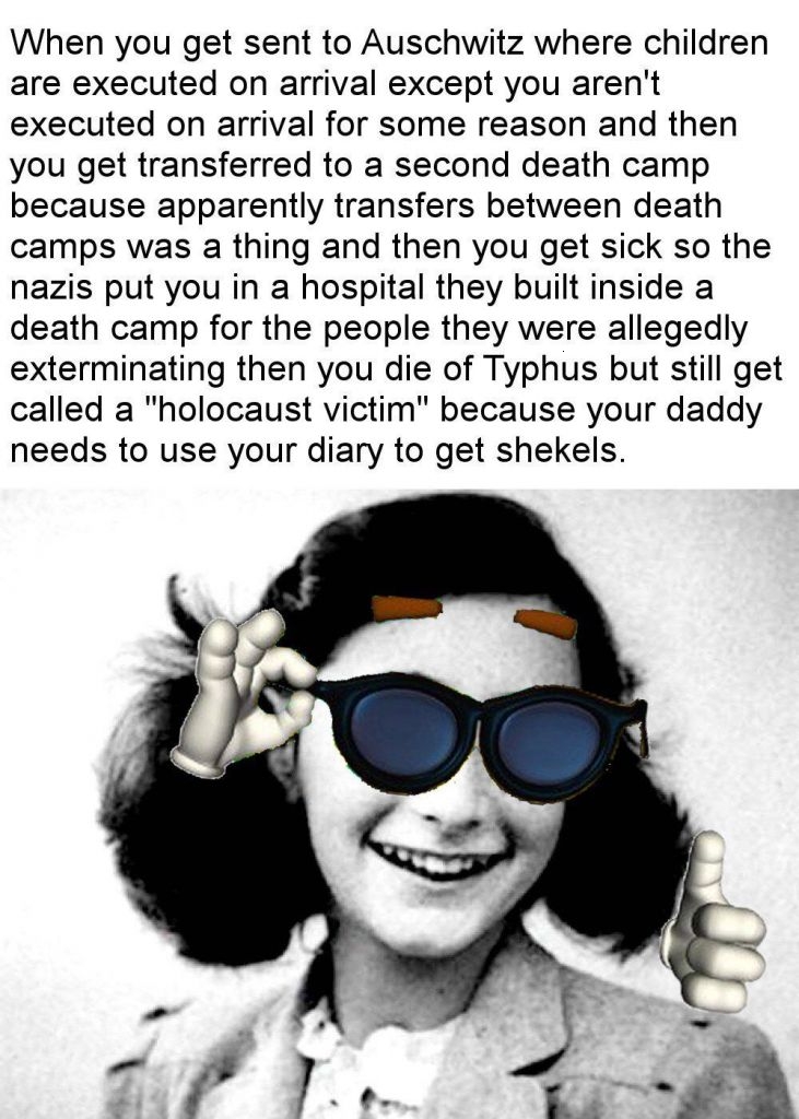 >>532891669Funny thing is most normies assume Ann Frank was gassed but she actually died in a camp hospital from typhoid. What kind of death camps have hospitals for the prisoners? And remember, NONE of the allied nations offered to take the jews as refugees nor did they offer supplies for the prisoners nor did they try to ease the crisis in Germany so they'd have supplies to provide to the prisoners.So basically no one wanted the jews and Germany was forced into allowing their condition to deteriorate to inhumane levels--sort of like what Israel does to Palestine.