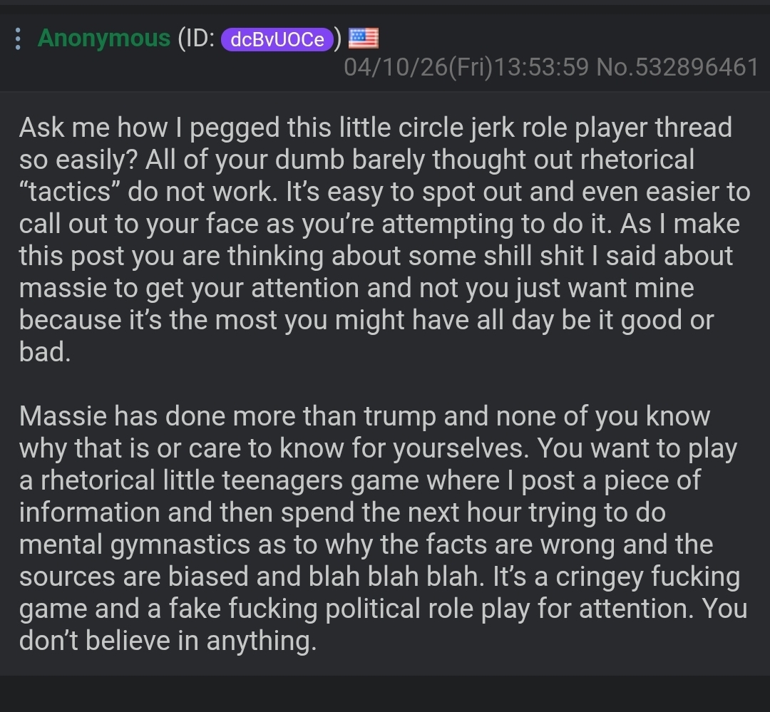Ask me how I pegged this little circle jerk role player thread so easily? All of your dumb barely thought out rhetorical “tactics” do not work. It’s easy to spot out and even easier to call out to your face as you’re attempting to do it. As I make this post you are thinking about some shill shit I said about massie to get your attention and not you just want mine because it’s the most you might have all day be it good or bad.Massie has done more than trump and none of you know why that is or care to know for yourselves. You want to play a rhetorical little teenagers game where I post a piece of information and then spend the next hour trying to do mental gymnastics as to why the facts are wrong and the sources are biased and blah blah blah. It’s a cringey fucking game and a fake fucking political role play for attention. You don’t believe in anything.