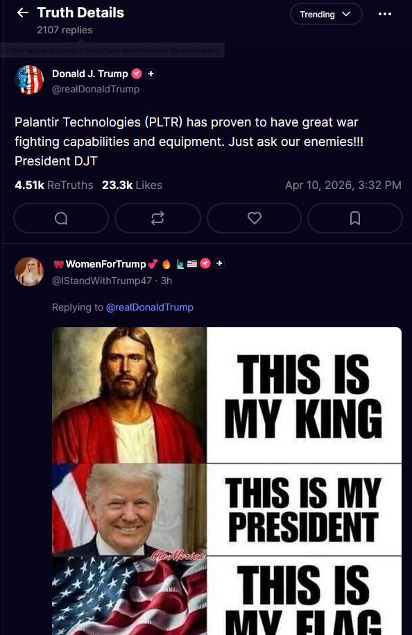 Palantir Technologies (PLTR) has proven to have great war fighting capabilities and equipment. Just ask our enemies!!! President DJThttps://truthsocial.com/@realDonaldTrump/posts/116380894672815869