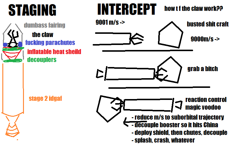 big fucking brain could atmosphere break and shape orbit flawlessly to hook into ISS but that would require at least 2, probably more orbital passes and all that shit takes precious fucking time where shit can go wrong.