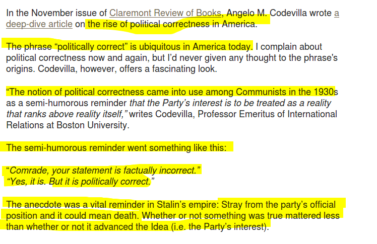 >>532908947political correctness is clearly a totalitarian term, not really communist. But it obviously implies that there are correct political views and incorrect, which is quite shocking if you think about it. Who decides it, important question.