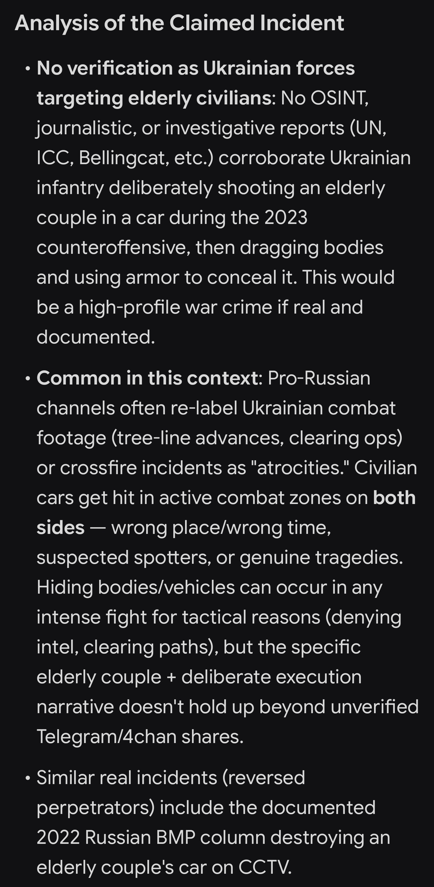 >Hohols ambush and kill 2 civilianshttps://files.catbox.moe/enamp3.mp4So has this been confirmed to be fake? I asked grok. If the "hohols ambush and kill civilians" claim is real then this would be a high profile war crime, yeah? But no credible source picked it up.