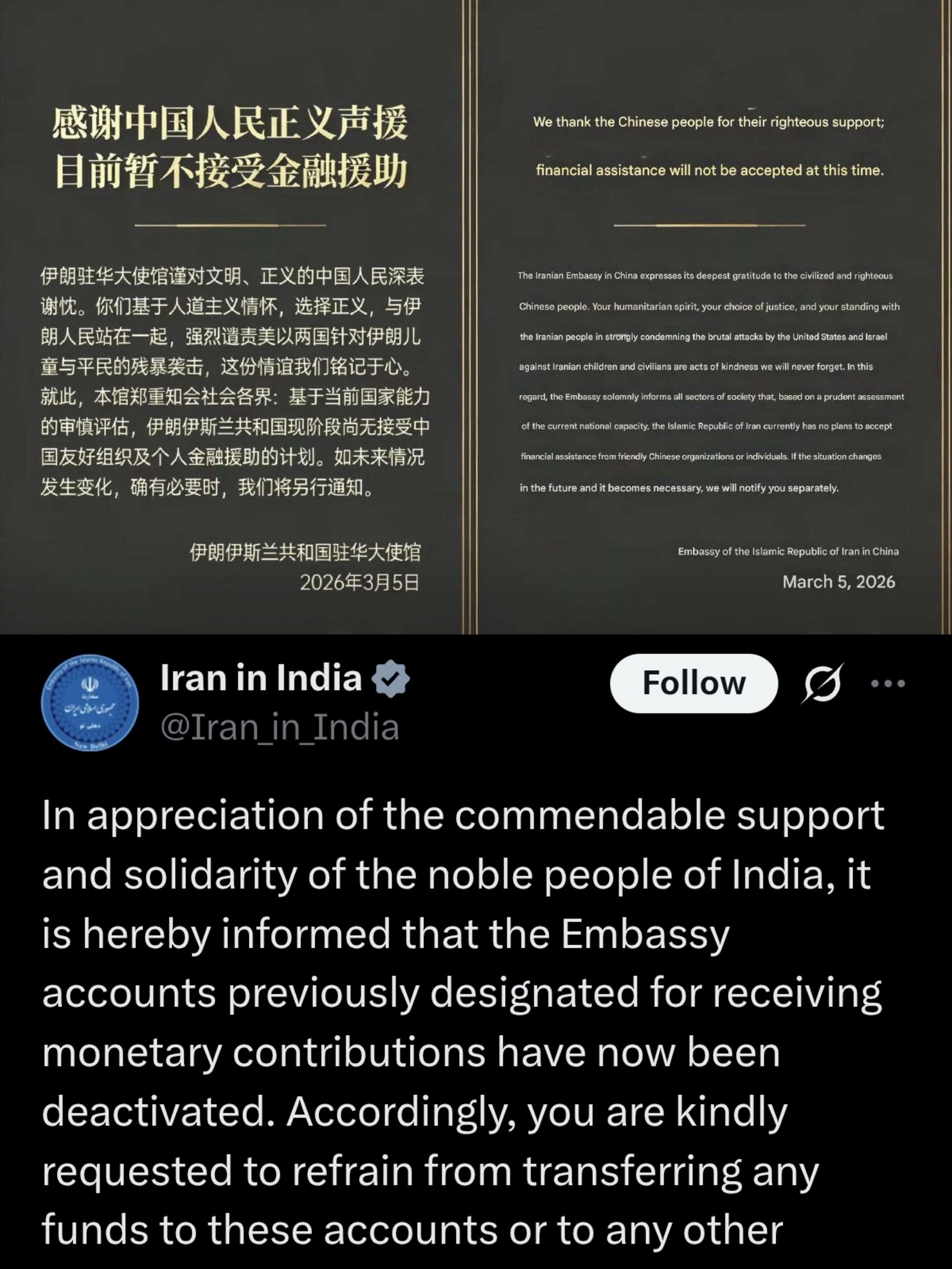 >Iranian Embassies in India and China had to shut down monetary fronts in their respective countries because people had been sending money to bomb Americans to kingdom heaven