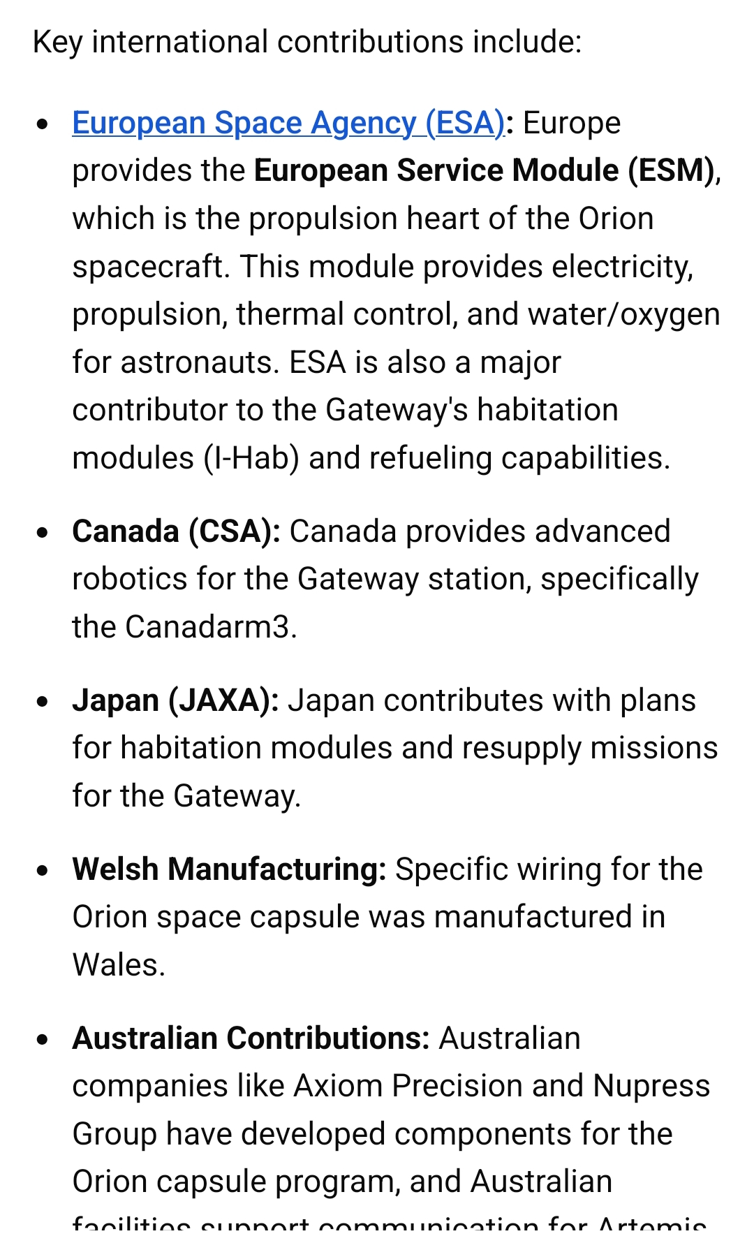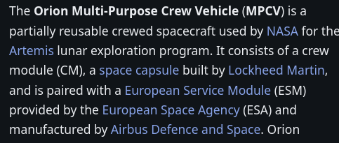 >>532916156> Without the rest of the world’s help.lol.> Europe's primary role in Artemis II is providing the European Service Module (ESM), the propulsion, power, and life-support heart of the Orion spacecraft. Developed by ESA (European Space Agency) and built by Airbus, the ESM provides 33 engines, electricity via solar arrays, and water/air for the crew.