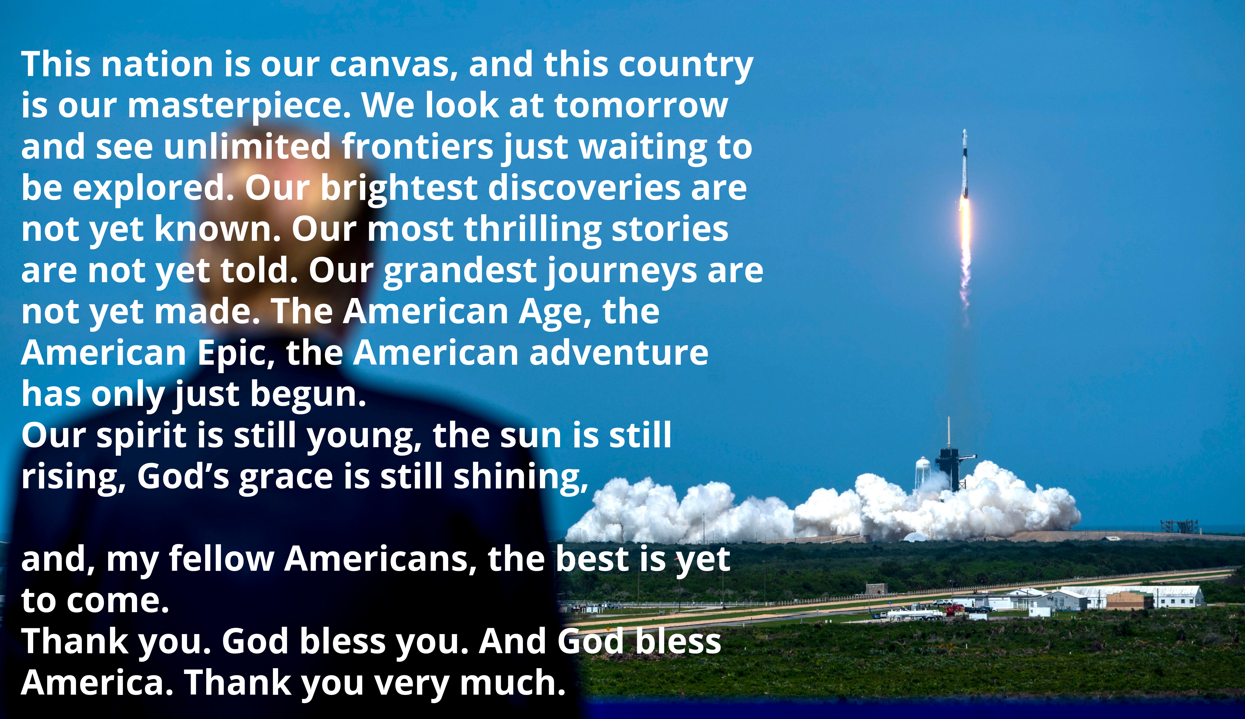 MY FELLOW AMERICAN CITIZENS!THE SOLAR SYSTEM, IS YOURS!THE GALAXY, IS YOURS!THE SUPER CLUSTER, IS YOURS!THE UNIVERSE, IS YOURS!WE WILL MAKE SPACE EXPLORATION GREAT AGAINGOD SPEED TO THE STARS AND THE MEN THAT DARE TO DREAM BIG AND DO WHAT NO ONE ELSE CAN, AMERICAN INGENUITY AND GUTS!