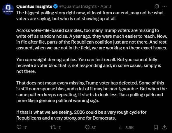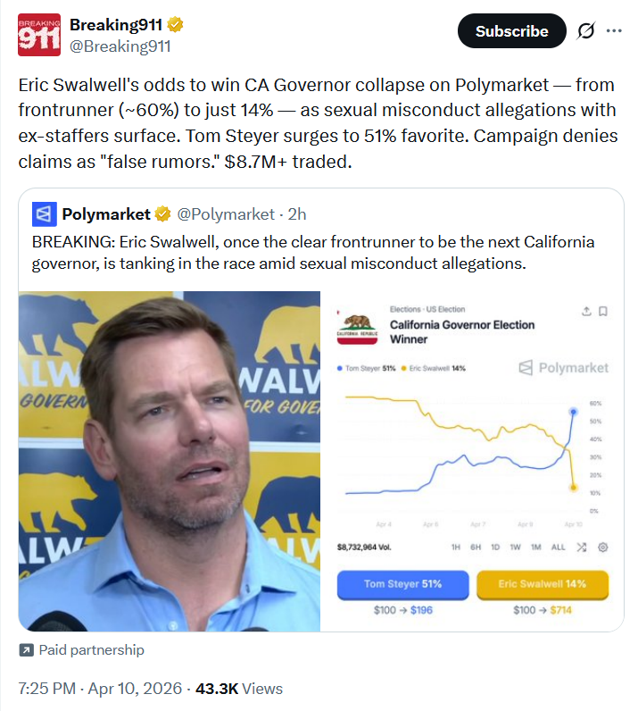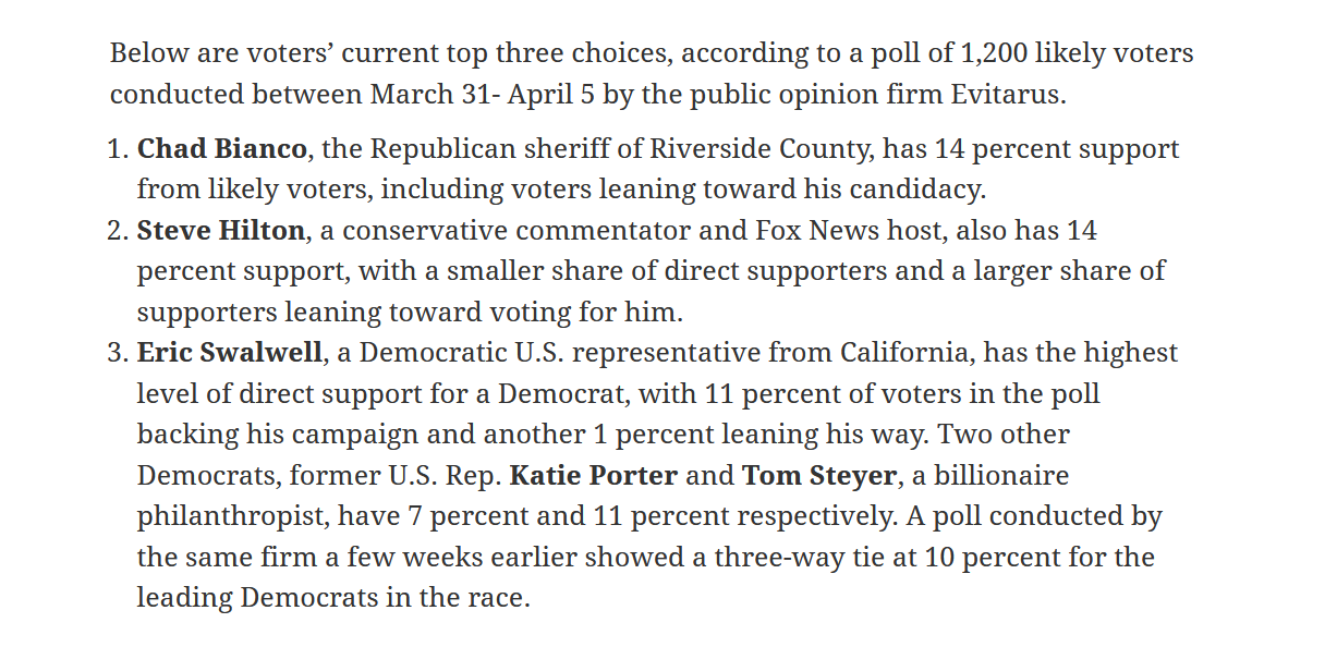 In california I've been saying this for about 2-3 weeks, but polls have the two republican candidates with about 16% , while swallwell had about 15% and Steyer had about 12%Steywer PROBABLY did this to torpedo swalwell, hoping that his supporters consolidate around Stetwer. But if they don't, the republicans will win the top two spots in Caliwali and win the election itself.