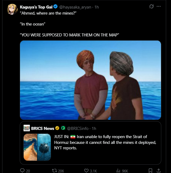 >>532921962>“Ahmed, where are the mines?”>“In the ocean”>“YOU WERE SUPPOSED TO MARK THEM ON THE MAP”