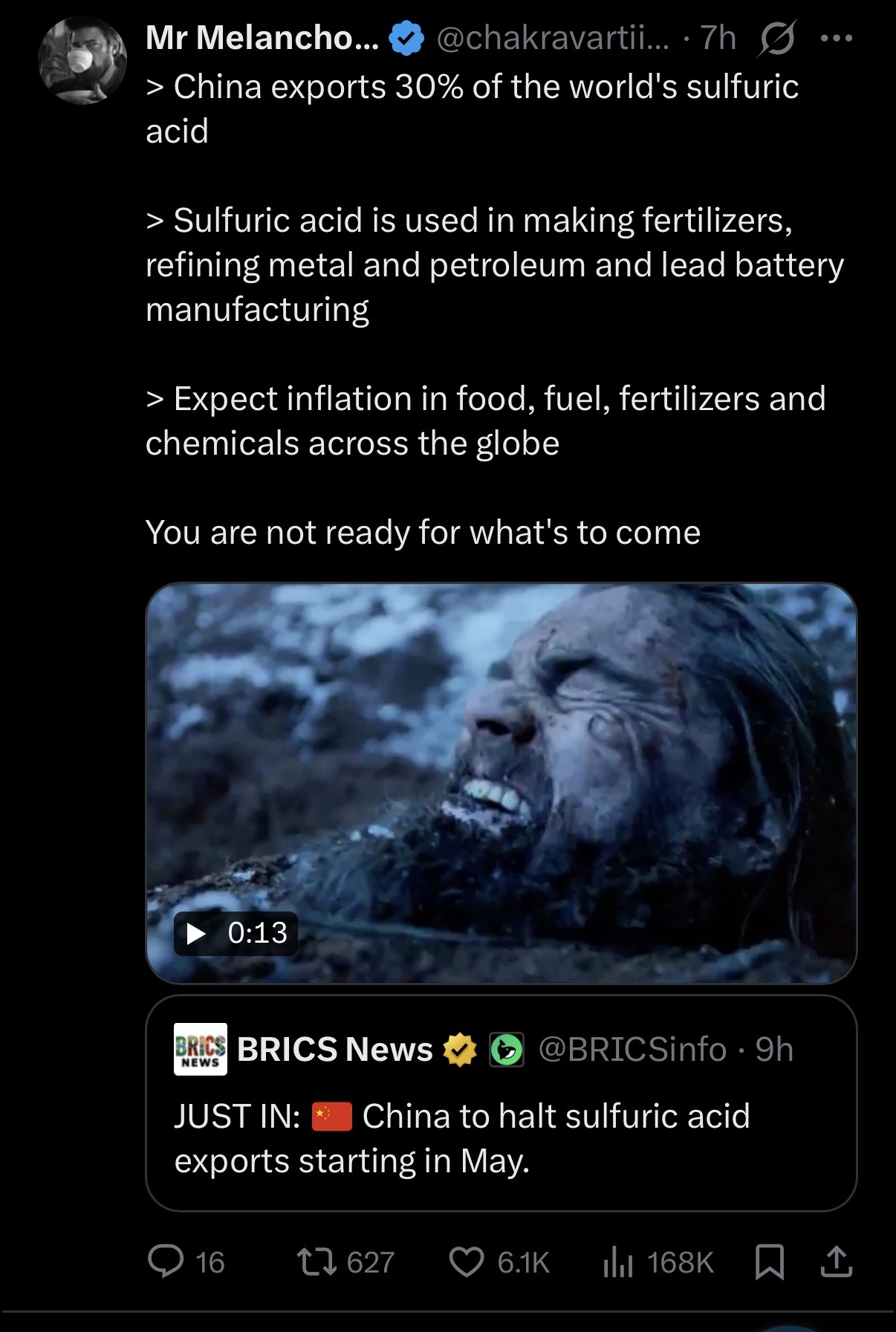 I asked my local ai to do some web searches and game the scenario if China halts 100% of exports. its not good.This is the conclusion>A complete Chinese export halt of sulfuric acid would represent one of the most severe industrial supply shocks in modern history. The global market simply cannot compensate quickly enough due to:> Minimal excess capacity (only 5-6% globally)> Long lead times for new production (30+ months minimum)> Raw material constraints (sulfur availability)> Infrastructure bottlenecks (storage, transport limitations)> Environmental and regulatory hurdles>The consequences would be catastrophic for food security in Southeast Asia, severe industrial disruptions globally, and significant economic contraction worldwide. Recovery would take 4-6 years and require billions in investment.>This scenario demonstrates the critical vulnerability created by concentration of production in single countries and underscores the urgent need for supply chain diversification, strategic stockpiling, and international cooperation on resource security.>Final Warning: The world's dependence on sulfuric acid as a strategic commodity makes it potentially more dangerous than oil in terms of immediate industrial impact. A 100% Chinese export halt would trigger a global crisis that cannot be quickly resolved here is the full texthttps://pastebin.com/Lq62GK0fi tried to create an image but its resolution was too large for 4chan, sorry