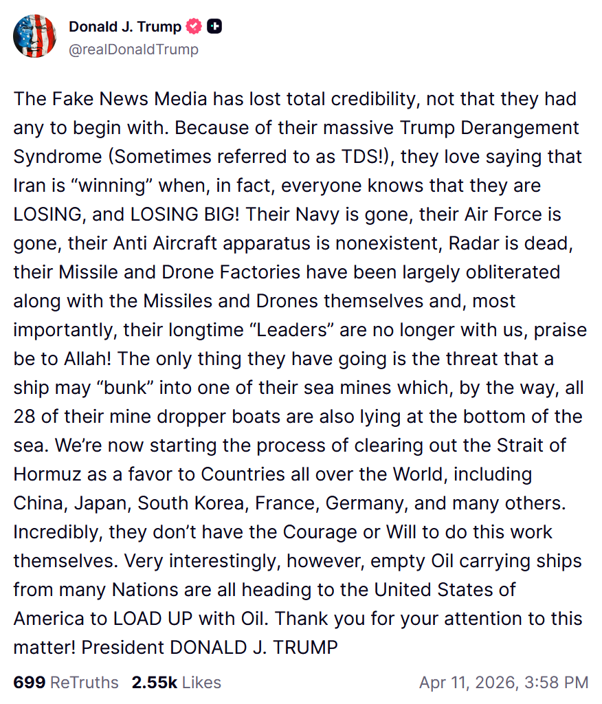 https://truthsocial.com/@realDonaldTrump/posts/116386190374675994>The Fake News Media has lost total credibility, not that they had any to begin with. Because of their massive Trump Derangement Syndrome (Sometimes referred to as TDS!), they love saying that Iran is “winning” when, in fact, everyone knows that they are LOSING, and LOSING BIG! Their Navy is gone, their Air Force is gone, their Anti Aircraft apparatus is nonexistent, Radar is dead, their Missile and Drone Factories have been largely obliterated along with the Missiles and Drones themselves and, most importantly, their longtime “Leaders” are no longer with us, praise be to Allah! The only thing they have going is the threat that a ship may “bunk” into one of their sea mines which, by the way, all 28 of their mine dropper boats are also lying at the bottom of the sea. We’re now starting the process of clearing out the Strait of Hormuz as a favor to Countries all over the World, including China, Japan, South Korea, France, Germany, and many others. Incredibly, they don’t have the Courage or Will to do this work themselves. Very interestingly, however, empty Oil carrying ships from many Nations are all heading to the United States of America to LOAD UP with Oil. Thank you for your attention to this matter! President DONALD J. TRUMPLOLOLOLOL