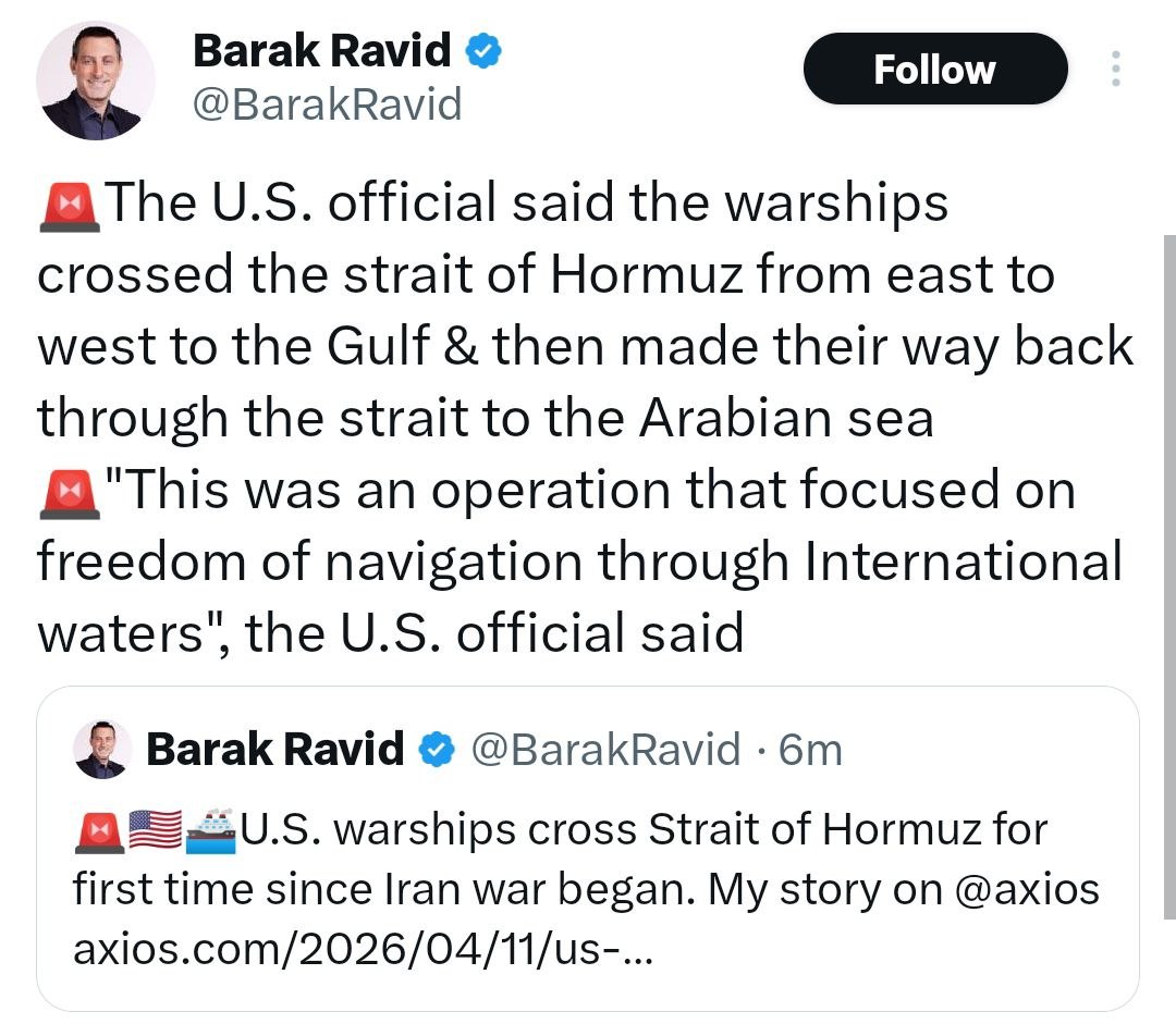 >>532949021>>532949056This shit is just weird, the Axios reporter is now claiming the american ships went in and out of the Strait just 'cuz.This is sounding like extreme bullshit to me.