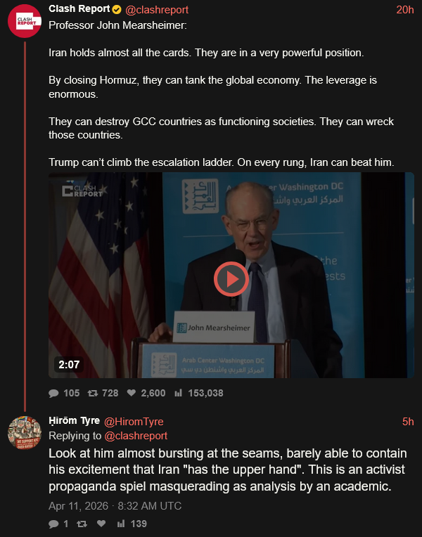 Arya Yadeghaar@AryJeay2m>Iran informed the Pakistani mediators that "if the ship's movement continues, it will be targeted within 30 minutes, and the Iran-US negotiations will also be affected.” — Fars>we warn>this time for real>don' thummiliate us while we cuck outYeah, Motjaba is either dead or comatose and they are just trying to surrender without Basij going Houti on them.